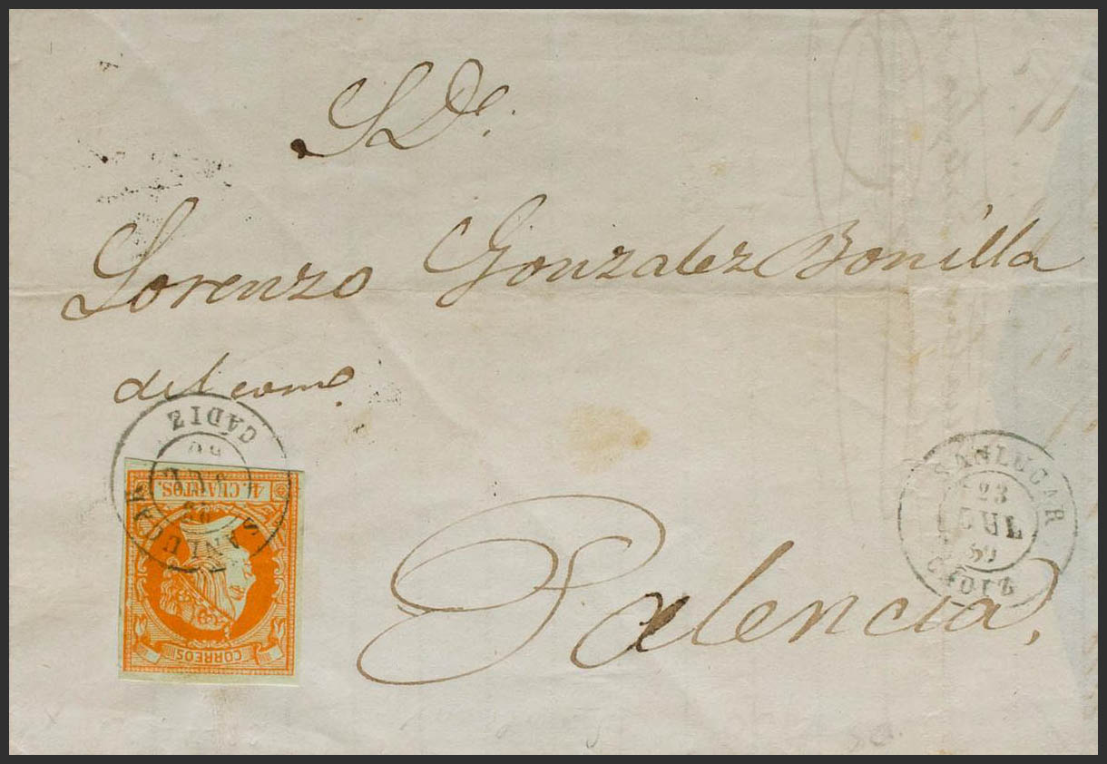 52. 1860. 4 orange cuartos . SANLUCAR DE BARRAMEDA to PALENCIA. Postmark SANLUCAR / CADIZ. MAGNIFICENT.