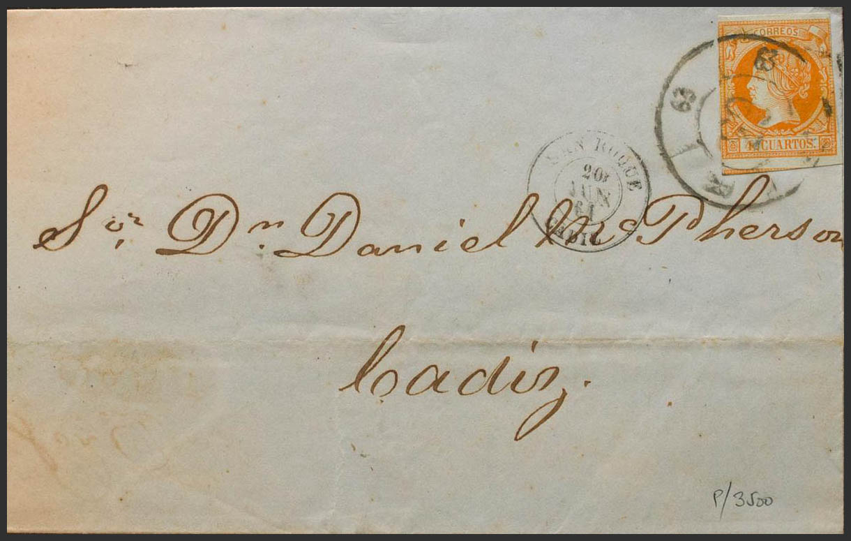 52. 1861. 4 orange cuartos . GIBRALTAR to CADIZ. Postmark R. CARRETA Nº63, of San Roque. MAGNIFICENT.