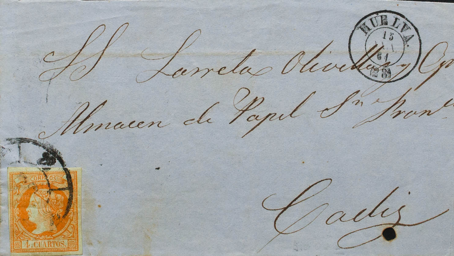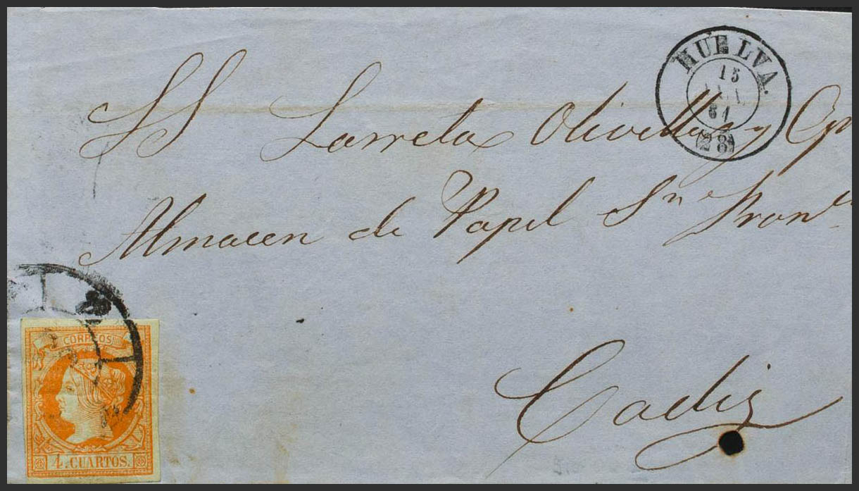 52. 1861. 4 orange cuartos . Front from HUELVA to CADIZ. Postmark R. CARRETA Nº28. MAGNIFICENT.