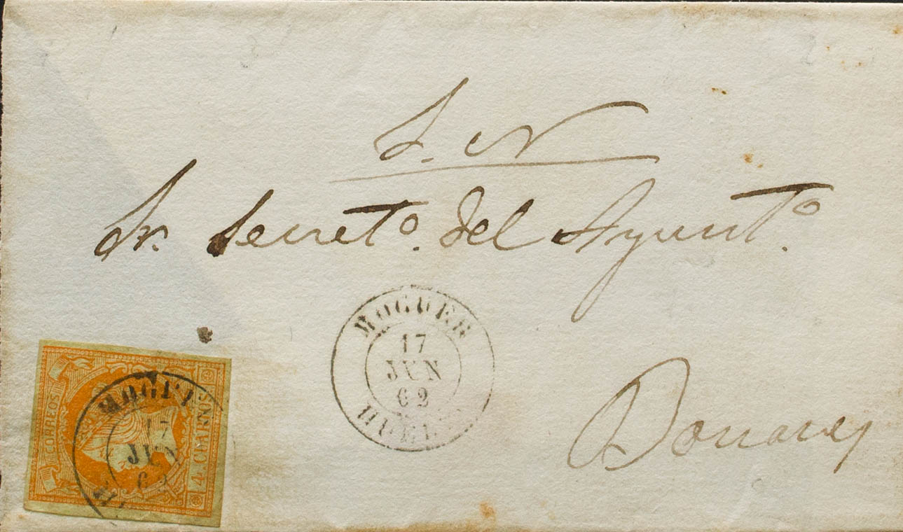 52. 1862. 4 orange cuartos . MOGUER to BONARES. Postmark MOGUER / HUELVA. MAGNIFICENT.
