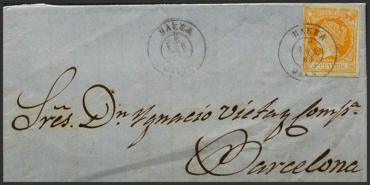 52. 1861. 4 orange cuartos . BAEZA to BARCELONA. Postmark BAEZA / JAEN. MAGNIFICENT.
