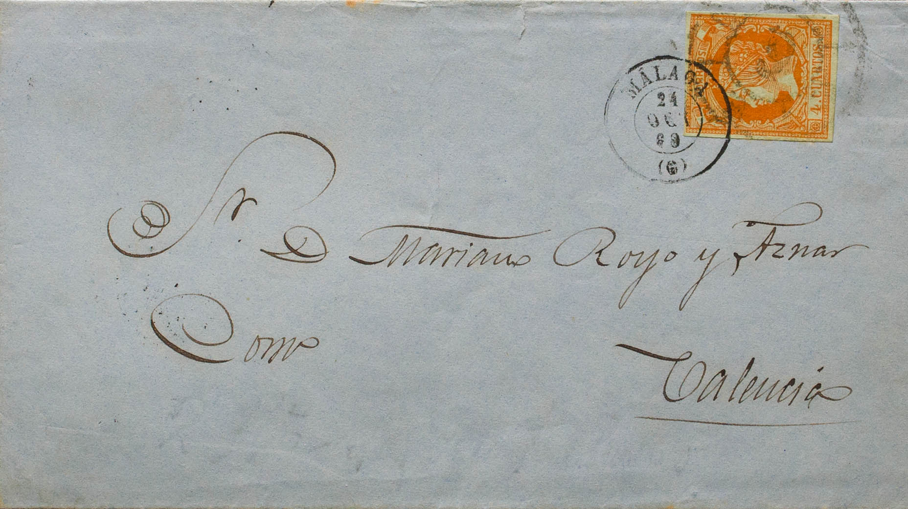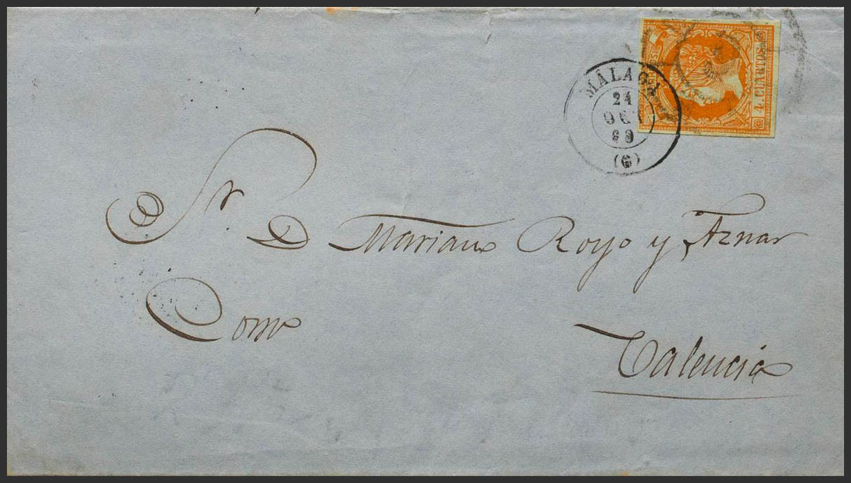 52. 1860. 4 orange cuartos . MALAGA to VALENCIA. Mixed postmark R.CARRETA Nº6 and dater MALAGA / (6). MAGNIFICENT.