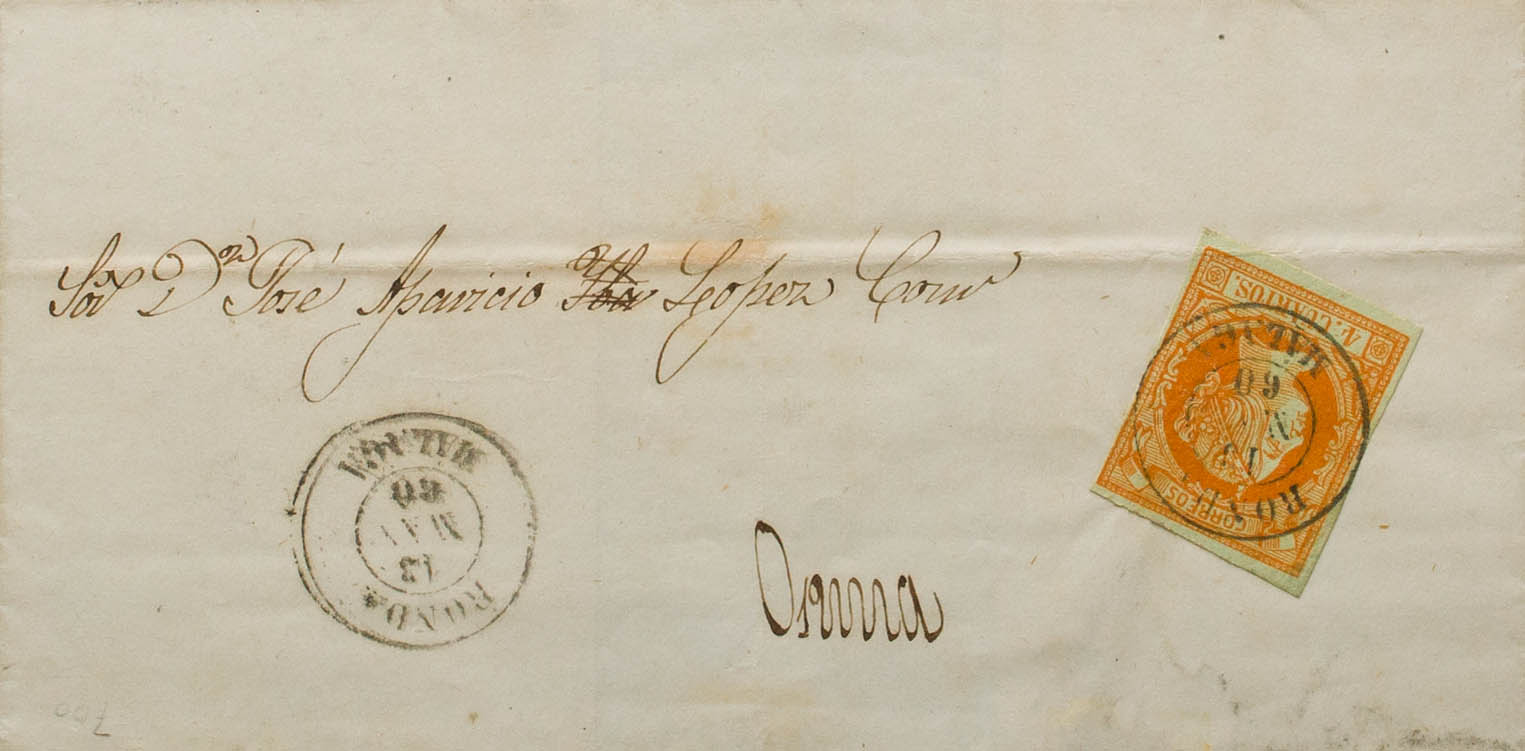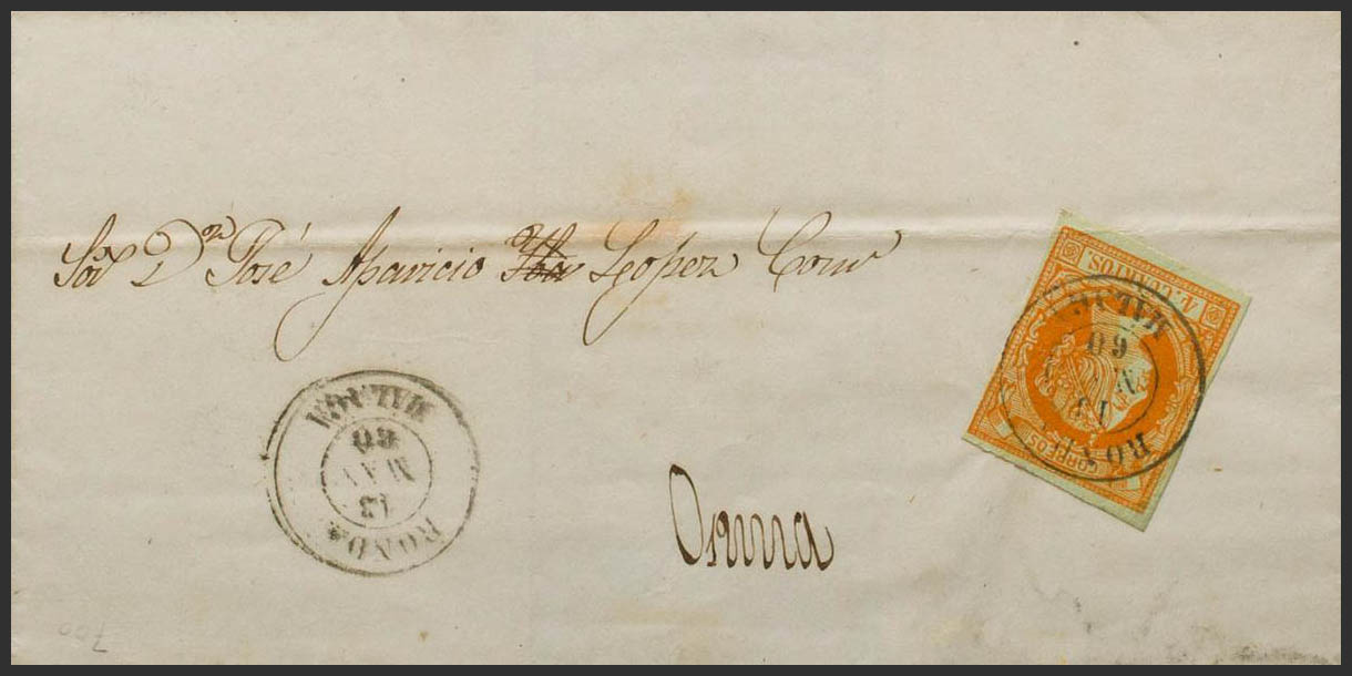 52. 1860. 4 orange cuartos . RONDA to OSUNA. Postmark ROUND / MALAGA. MAGNIFICENT.