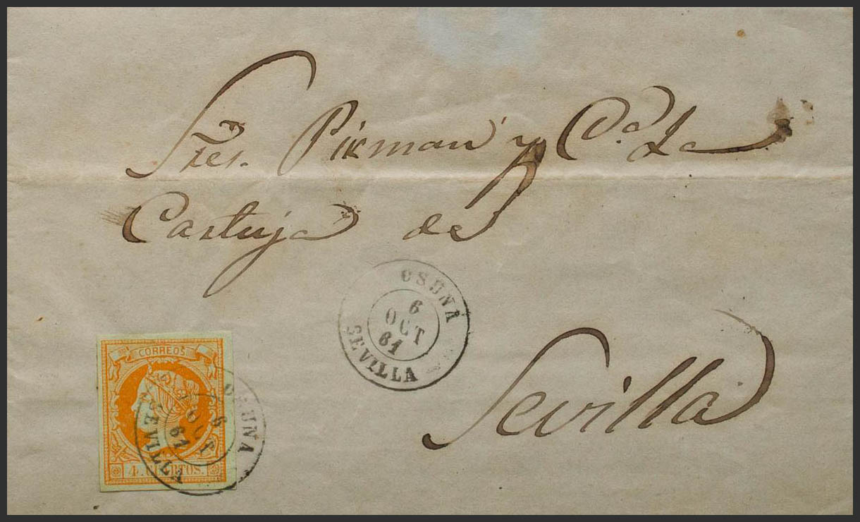 52. 1861. 4 orange cuartos . OSUNA to SEVILLE. Postmark OSUNA / SEVILLE. MAGNIFICENT.