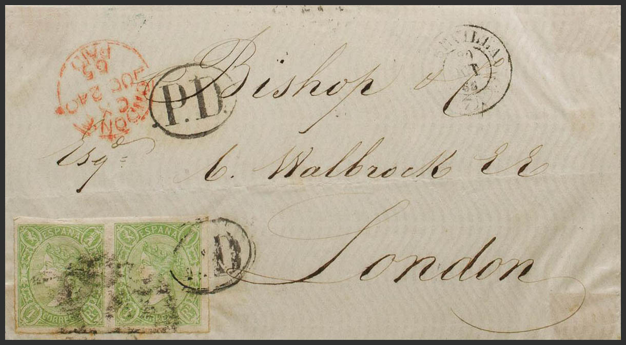 72(2). 1865. 1 real green, pair. Front from SEVILLE to LONDON (ENGLAND). MAGNIFICENT AND UNUSUAL COMBINATION OF POSTAGE TO COMPLETE THE RATE OF 2 REAIS, PROBABLY ONLY KNOWN.