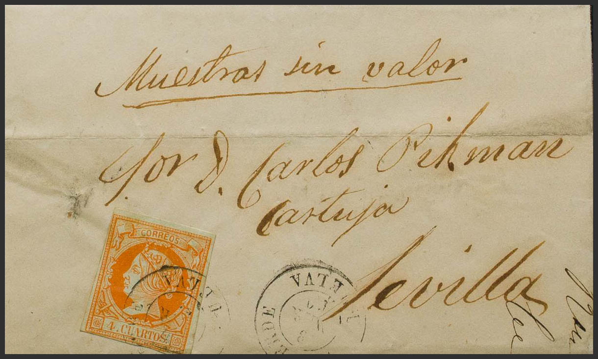 52. 1860. 4 orange cuartos . ZALAMEA LA REAL to SEVILLE. Postmark VALVERDE / HUELVA, on the front handwritten "Samples without value". MAGNIFICENT AND RARE.