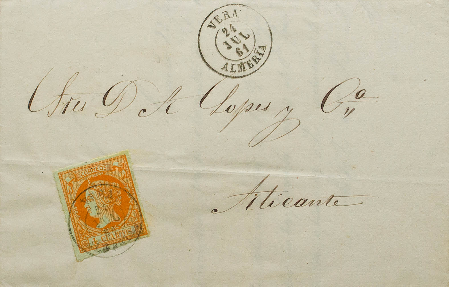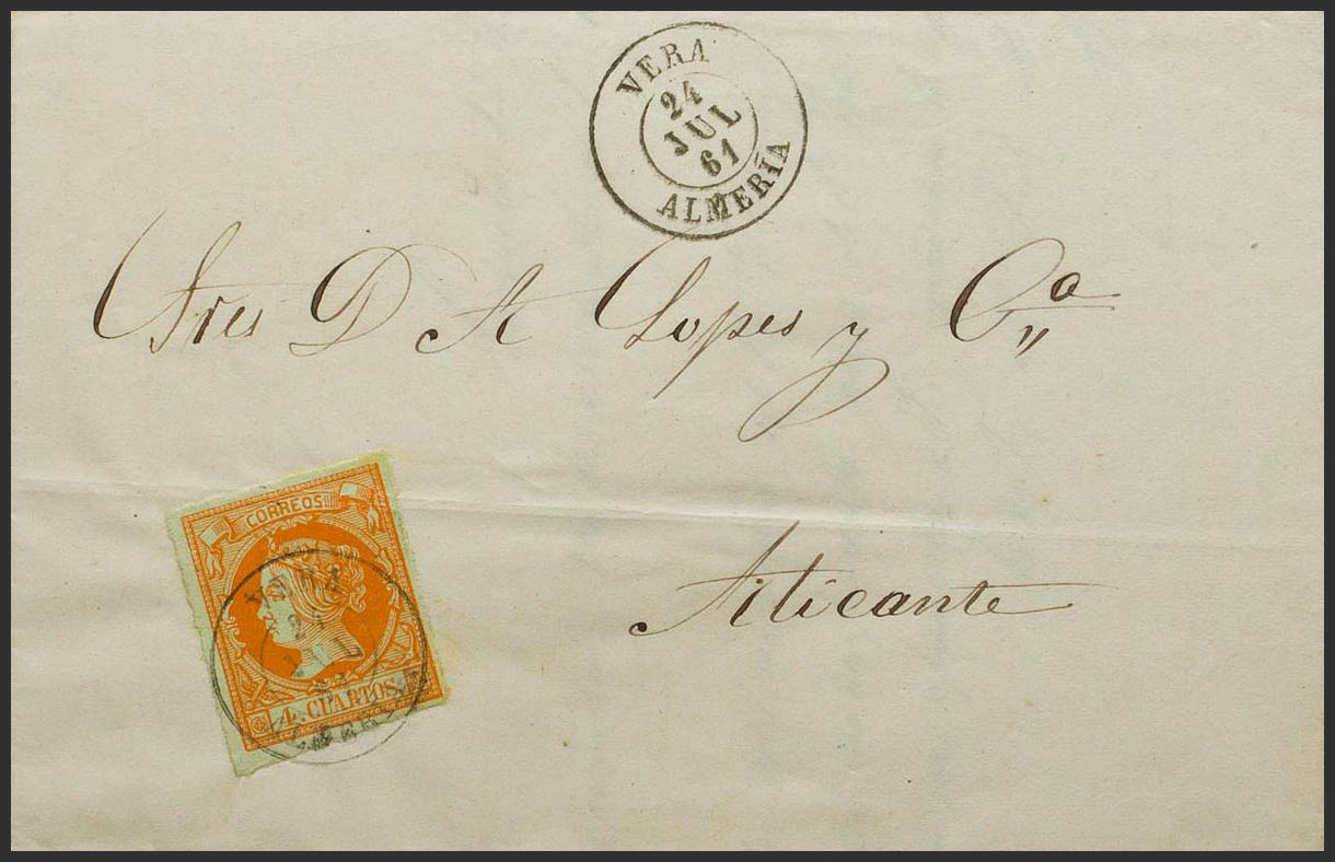 52. 1861. 4 orange cuartos . GARRUCHA (ALMERIA) to ALICANTE. Postmark VERA / ALMERIA. MAGNIFICENT.