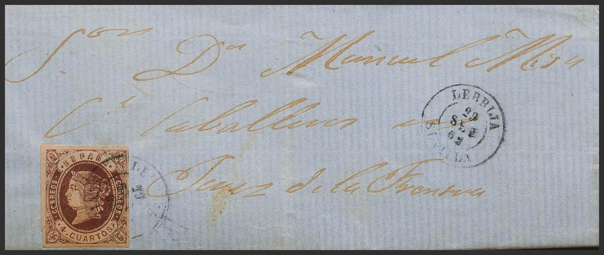 58. 1862. 4- cuartos chestnut. LEBRIJA to JEREZ DE LA FRONTERA. Postmark LEBRIJA / SEVILLE. MAGNIFICENT.