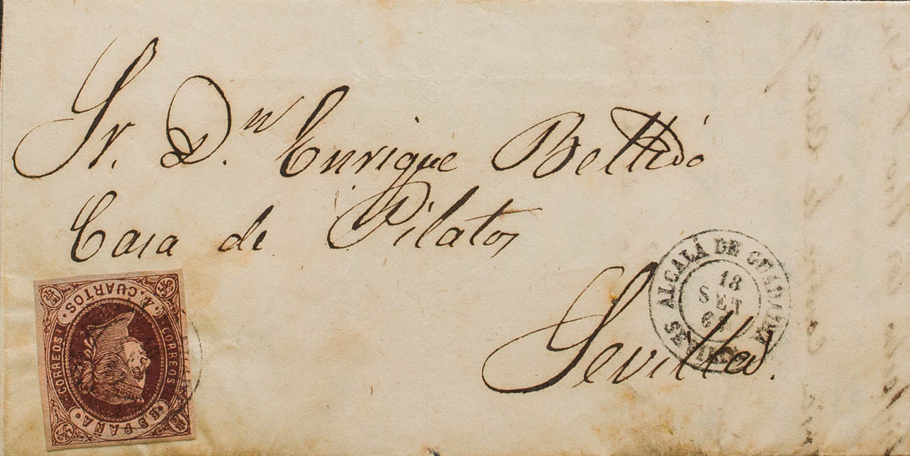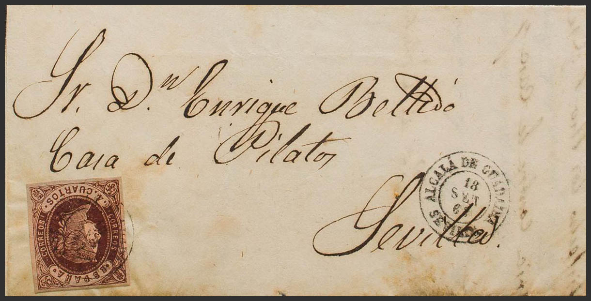 58. 1863. 4- cuartos chestnut. ALCALA DE GUADAIRA to SEVILLE. Postmark ALCALA DE GUADAIRA / SEVILLE. MAGNIFICENT.