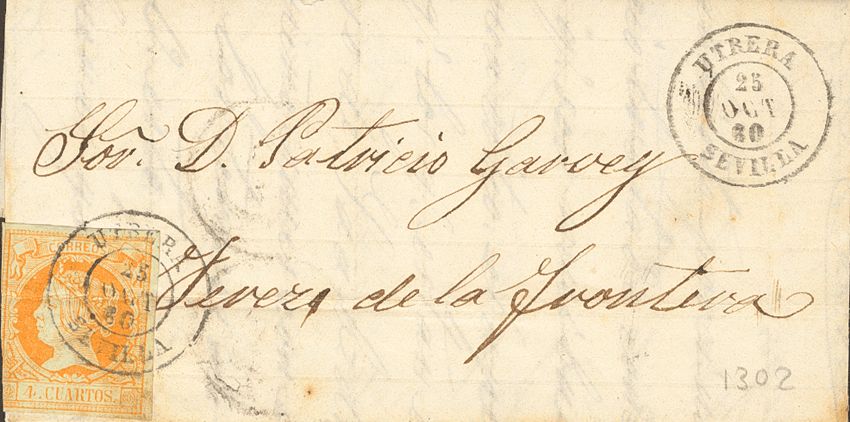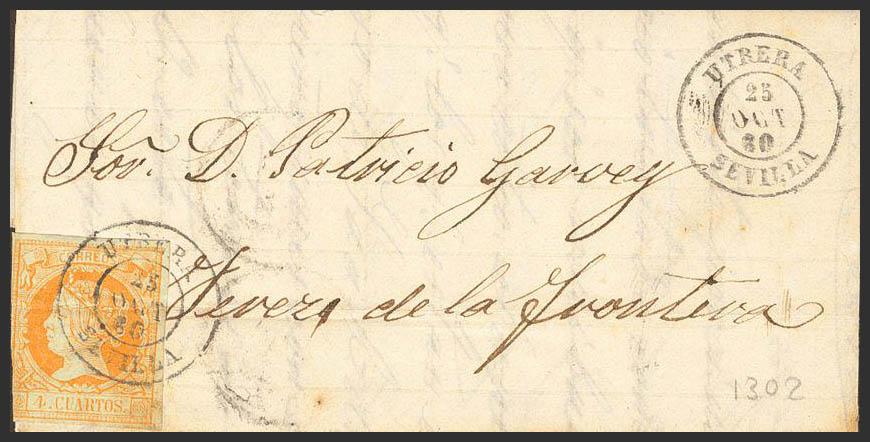 52. 1860. 4 cuartos yellow. UTRERA to SHERRY. Postmark UTRERA / SEVILLE. File fold.