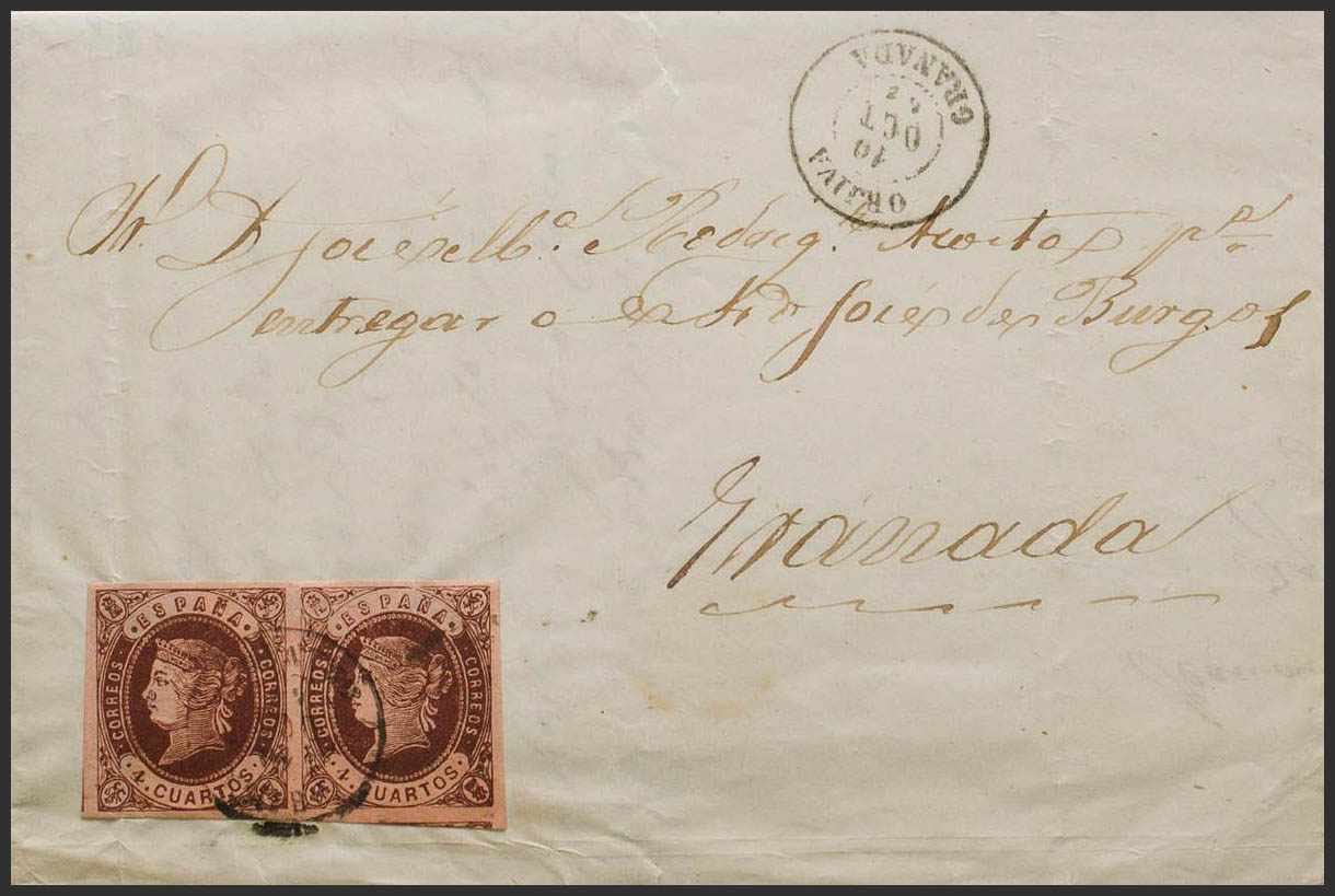58(2). 1862. 4 cuartos chestnut, pair. ORGIVA (GRANADA) to GRANADA. Postmark ORJIVA / GRANADA, double bearing. MAGNIFICENT AND RARE.