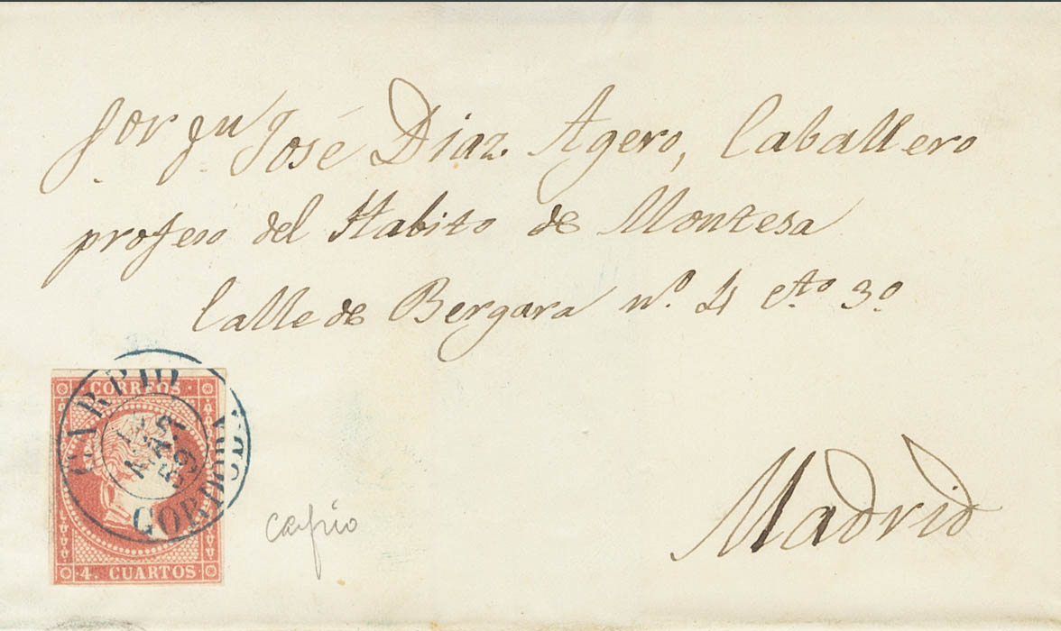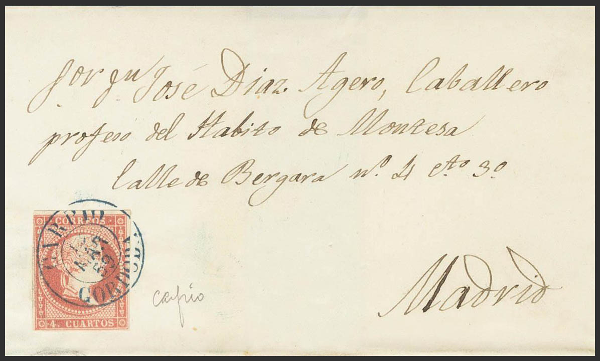 48. 1859. 4 cuartos red. CARPIO to MADRID. CARPIO / CORDOBA postmark (Type I), in blue. MAGNIFICENT AND RARE.