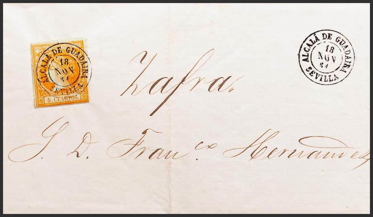 52. 1861. 4 orange cuartos . ALCALA DE GUADAIRA to ZAFRA. Postmark ALCALA DE GUADAIRA / SEVILLE. MAGNIFICENT AND RARE.