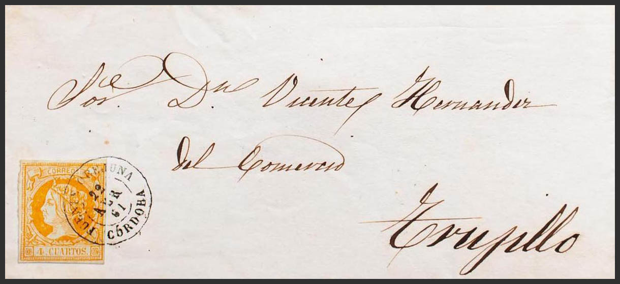 52. 1861. 4 orange cuartos . OVEJUNA SOURCE to TRUJILLO. Postmark FUENTE OVEJUNA / CORDOBA. MAGNIFICENT.