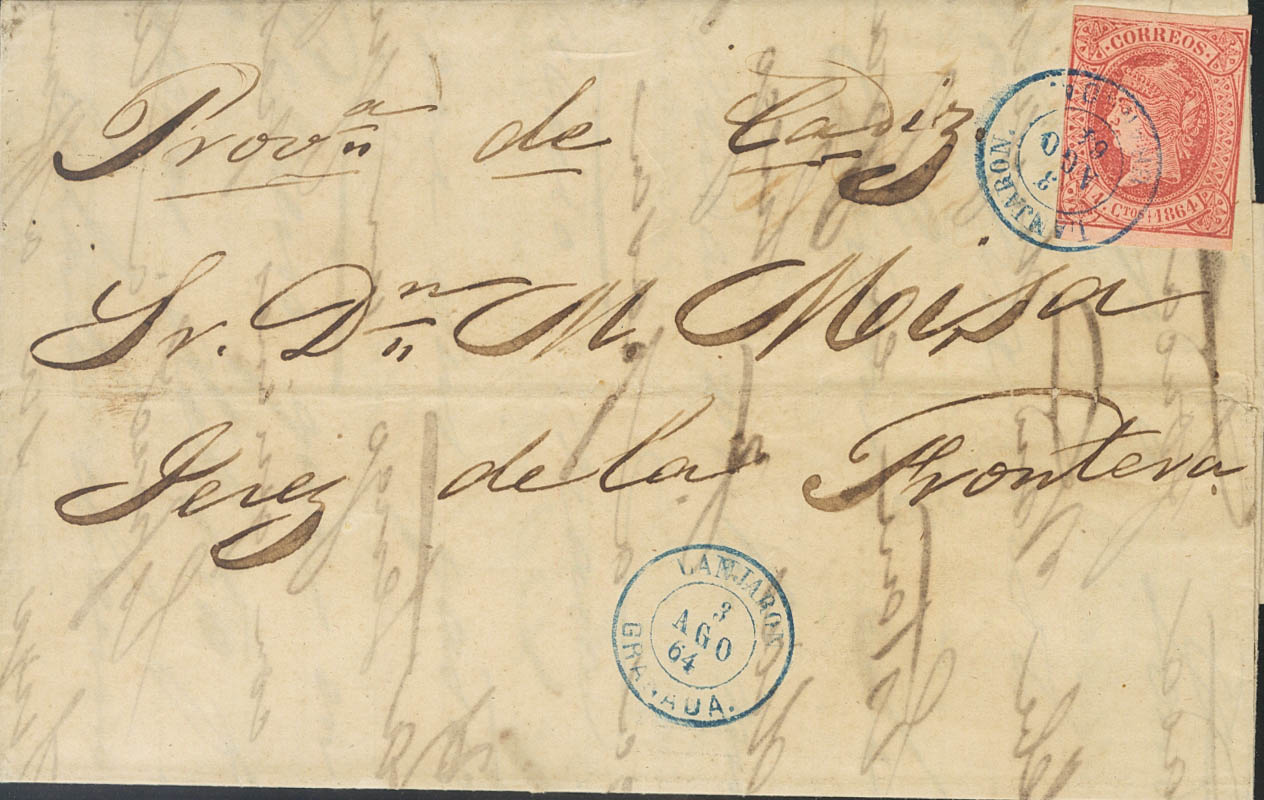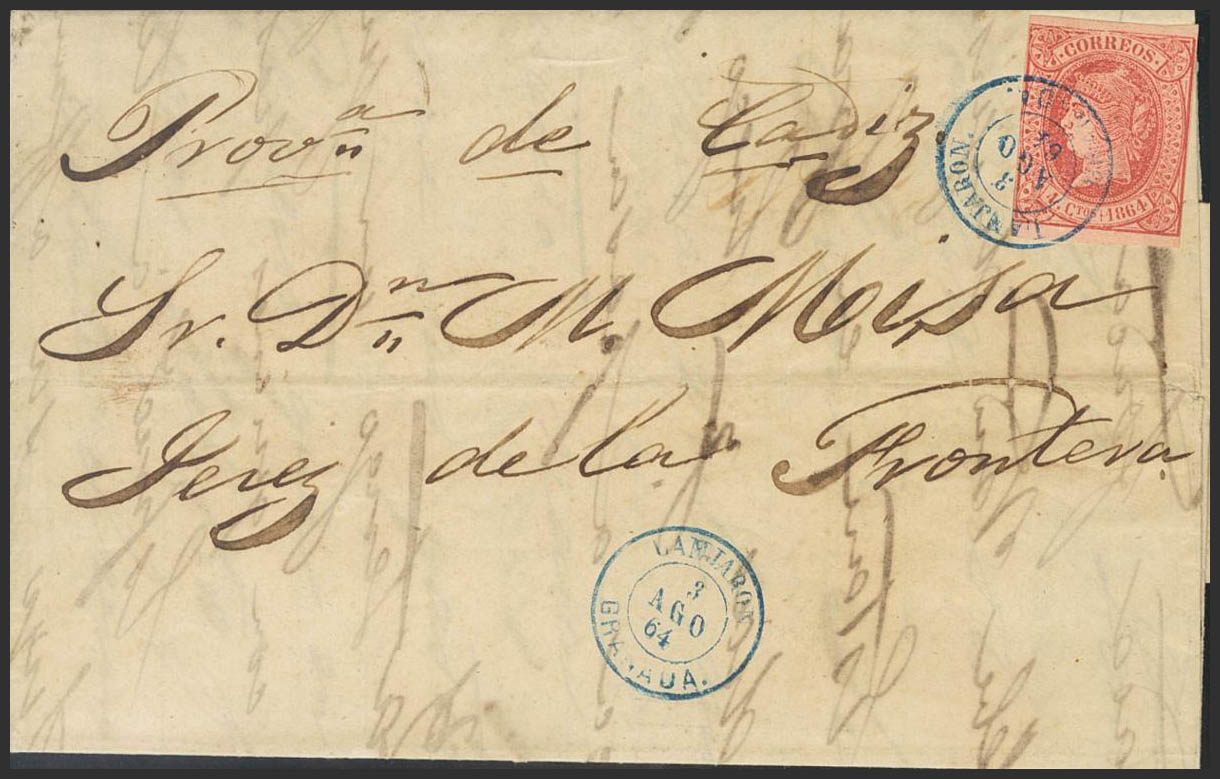 64. 1864. 4 cuartos red. LANJARON (GRANADA) to JEREZ. LANJARON / GRANADA postmark, in blue. MAGNIFICENT AND VERY PROBABLY THE ONLY ONE KNOWN, IT IS THE FIRST TIME WE HAVE KNOWN OF ITS EXISTENCE, LAIZ IN BLUE DOES NOT EVEN MENTION IT.