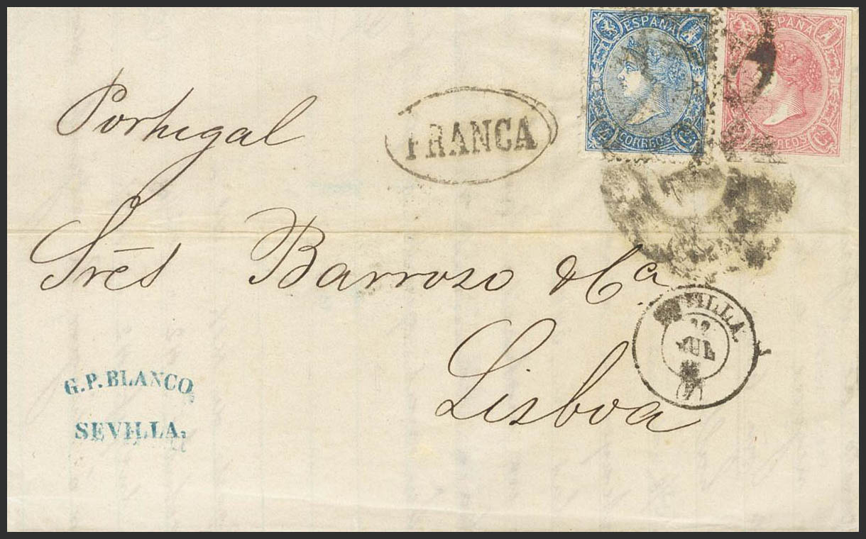 69, 75. 1865. 4 blue cuartos and 2 pink cuartos . SEVILLE to LISBON. MAGNIFICENT AND RARE COMBINATION OF AN UNTOOTHED AND TOOTHED ISSUE, IN ADDITION TO ITS UNUSUAL DESTINATION.