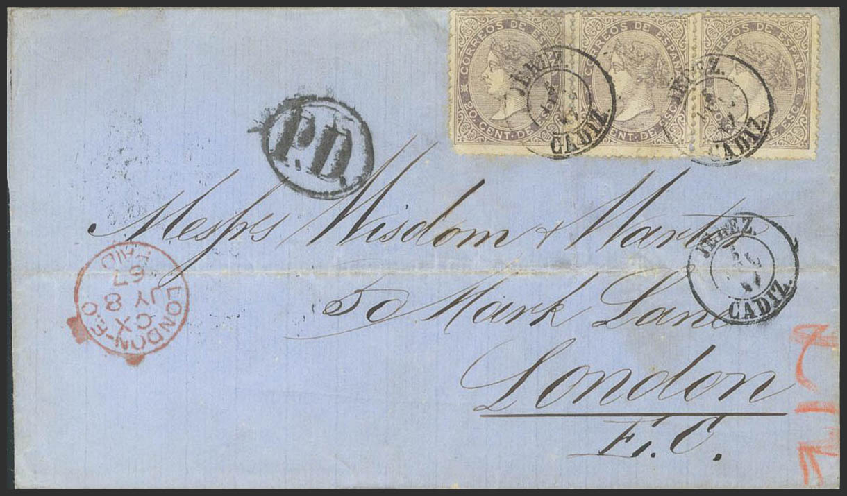 92(3). 1867. 20 cts lilac, three stamps. JEREZ to LONDON (ENGLAND). MAGNIFICENT AND RARE TRIPLE SIZE LETTER.