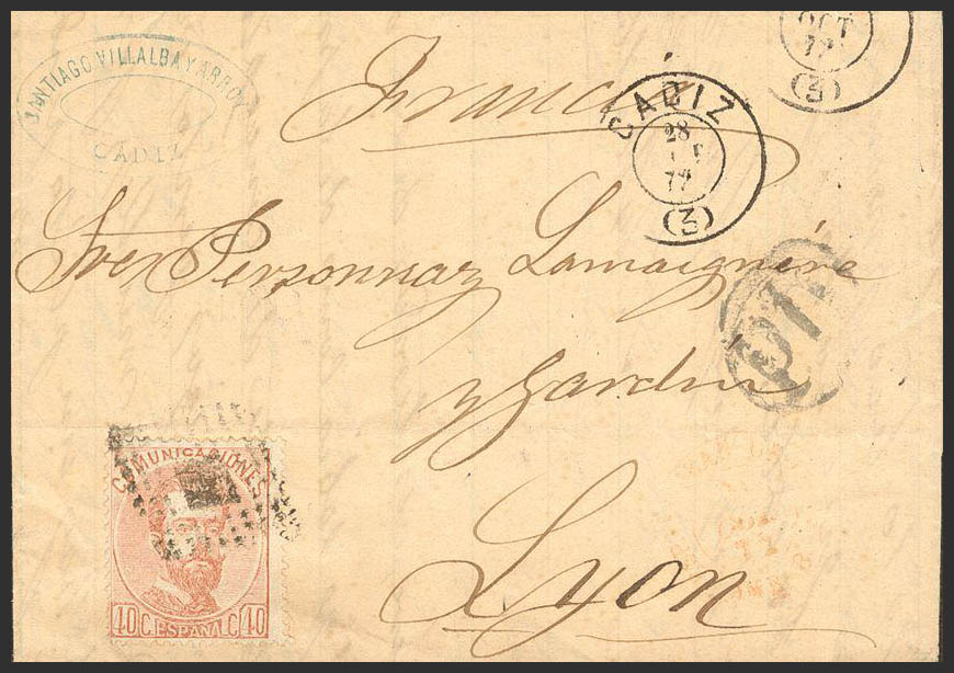 125. 1872. 40 chestnut cts. CADIZ to LYON. DOTTED RHOMBUS postmark. MAGNIFICENT,