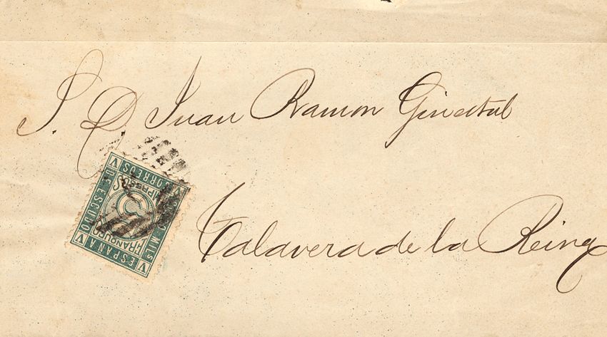 93. 1867. 5 thousand green. Front from MALAGA to TALAVERA. Postmark GRILL WITH Nº6. BEAUTIFUL AND RARE PRINT RATE.