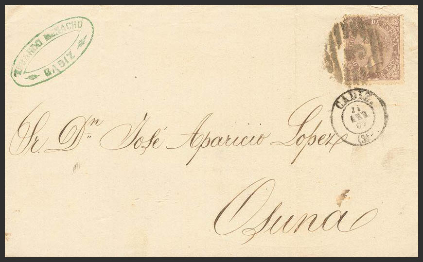 98. 1868. 50 thousand violet. CADIZ to OSUNA. Postmark GRILL Nº 3. BEAUTIFUL.