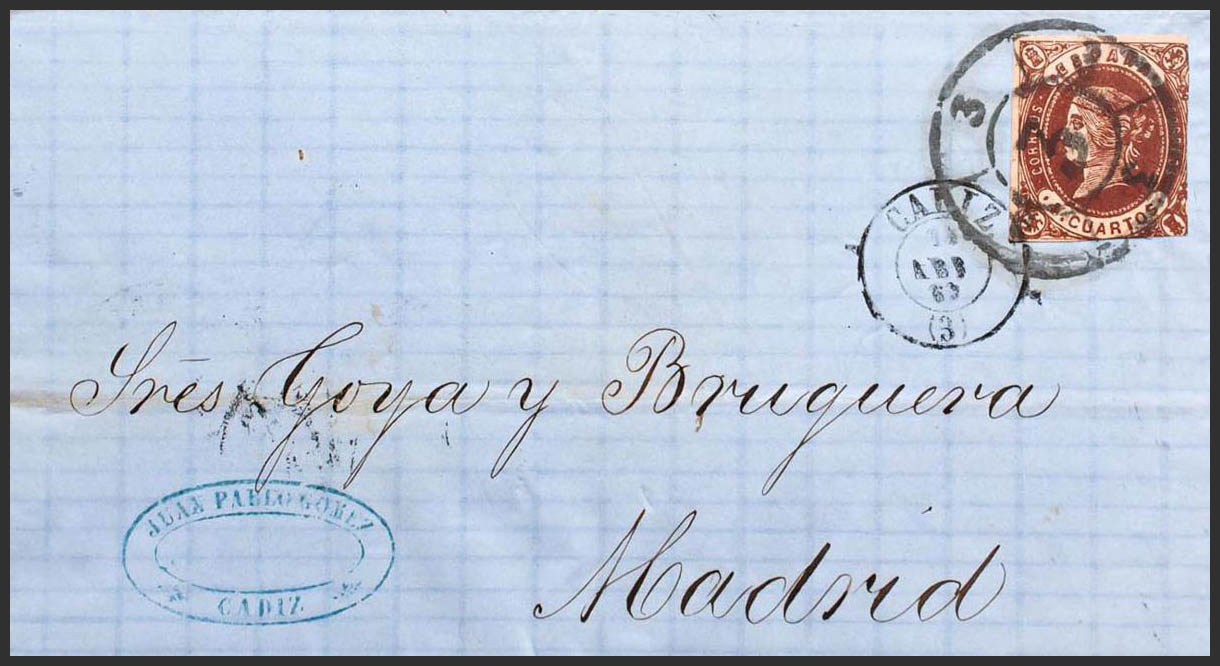 Andalusia. Postal History. R. CARRETA Nº3, from Cádiz. MAGNIFICENT.