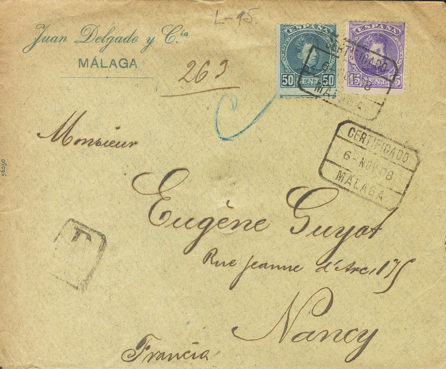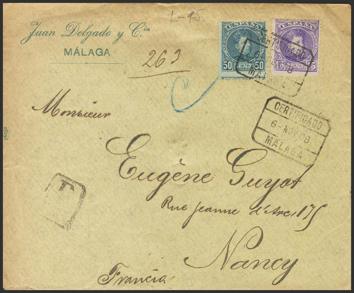 246, 252. 1908. 15 cts and 50 cts. Certificate from MALAGA to NANCY (FRANCE). On the back arrival. MAGNIFICENT.