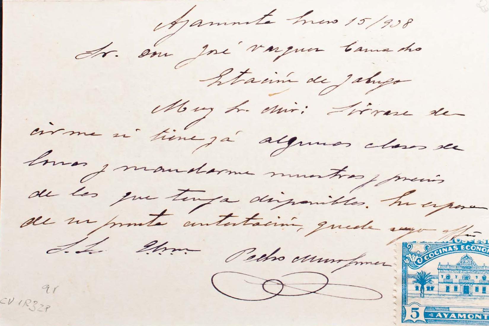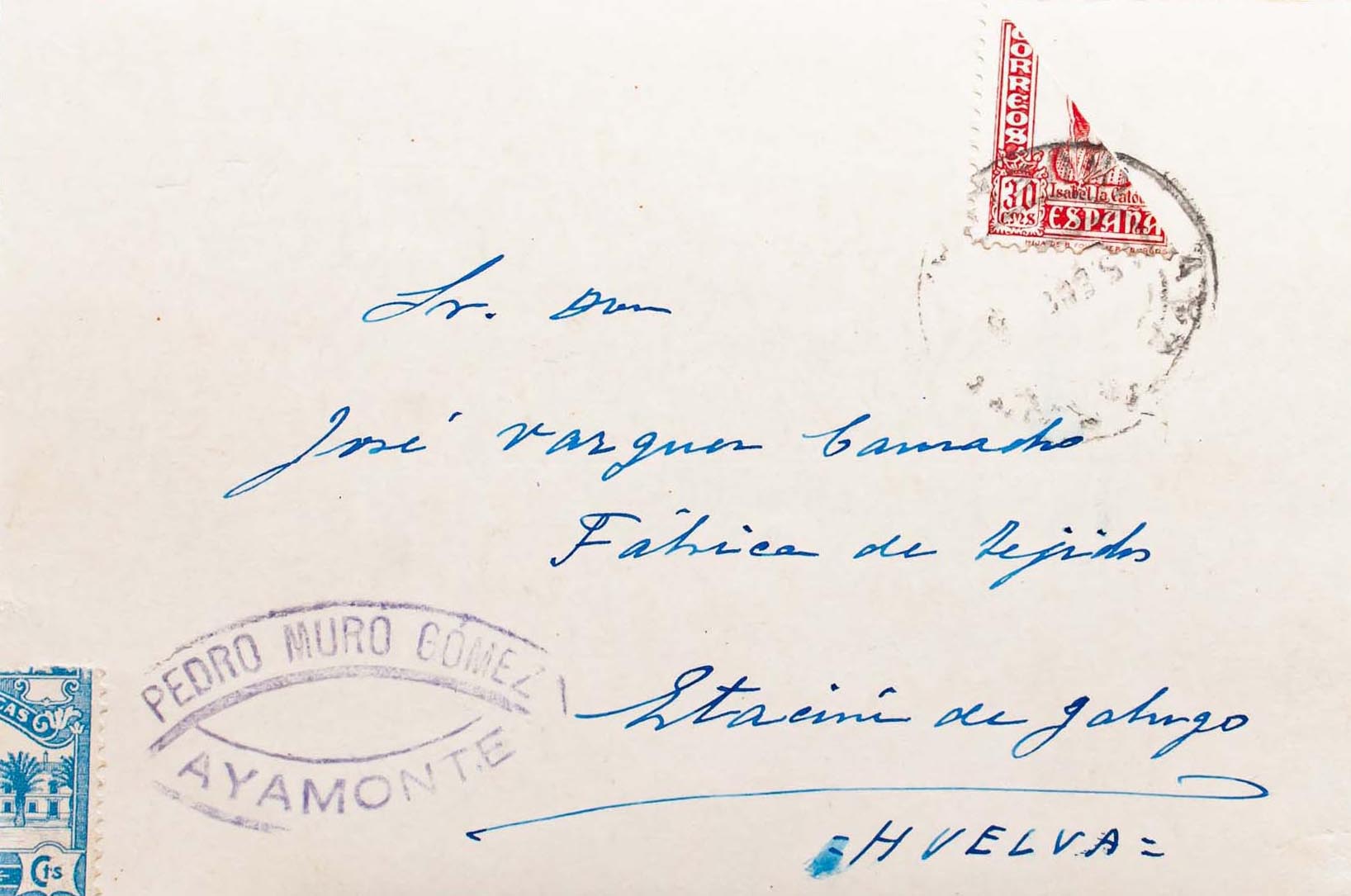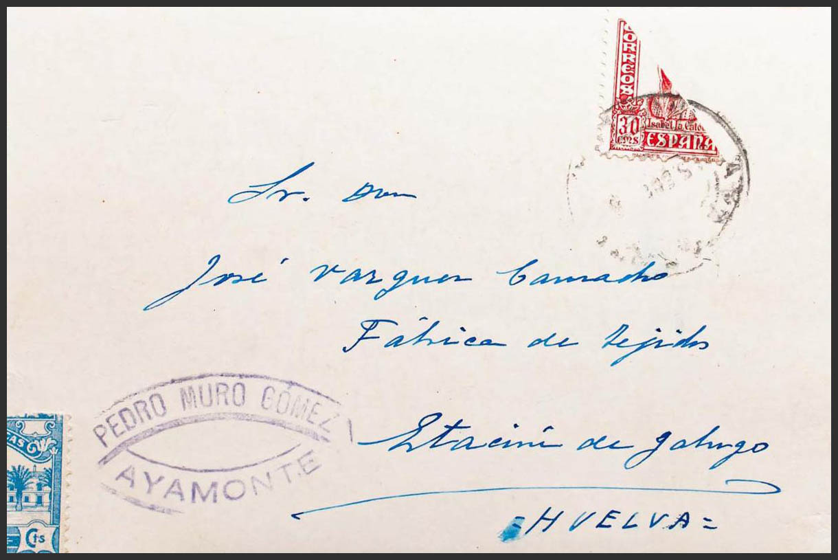 823B. 1938. 30 cts BISECTED carmine and 5 cts AYAMONTE blue. Postcard from AYAMONTE (HUELVA) to JABUGO. MAGNIFICENT.
