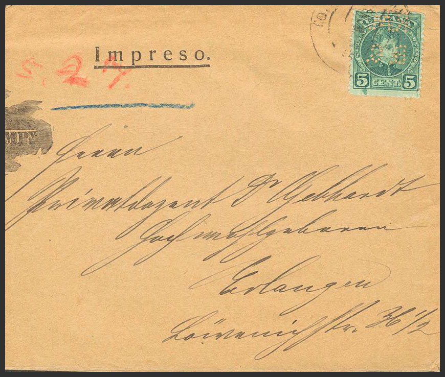 242. 1903. 5 cts green, perforated. Printed from MALAGA to ERLANGEN (GERMANY). Postmark MALAGA / (30). MAGNIFICENT AND RARE RATE OF PRINTS ABROAD.