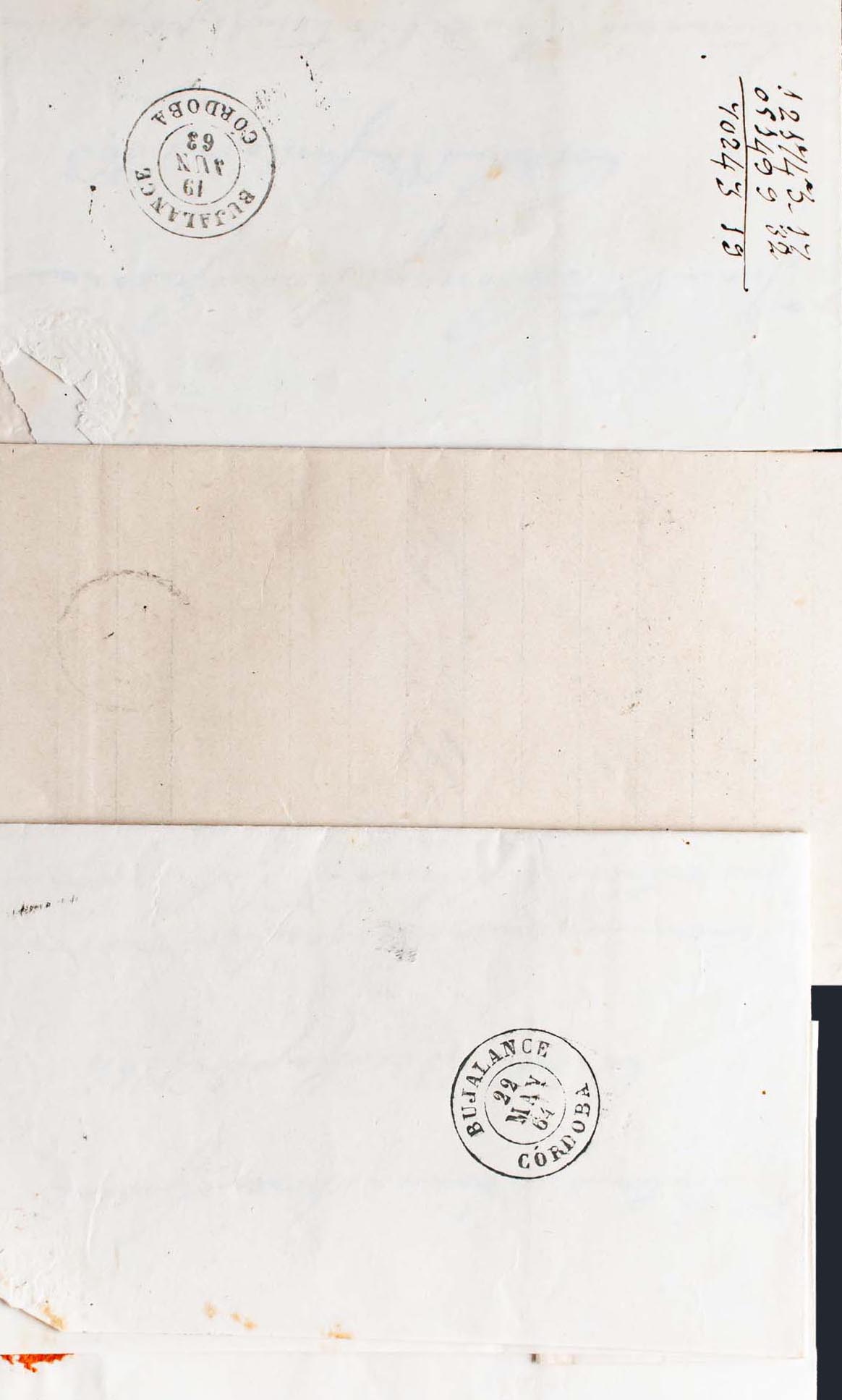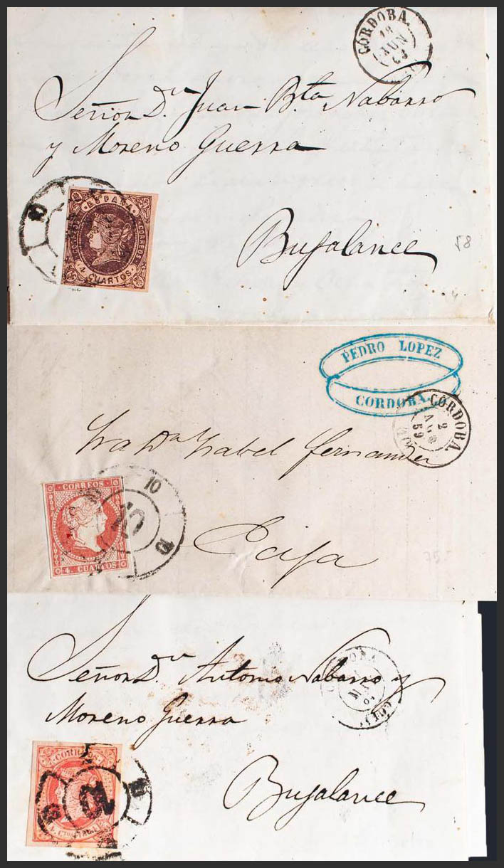 48, 58, 64. (1855ca). Set of three letters with 4- cuartos red, brown and pink stamps from CORDOBA to BUJALANCE and ECIJA and unused with R.CARRETA Nº10 postmark. MAGNIFICENT.