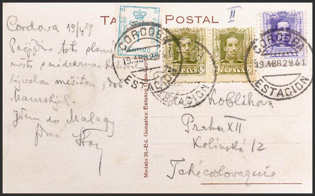 310(2), 316, 291. 1929. 2 cts olive green, two stamps, 20 cts violet and 1 cts green. Postcard from CORDOBA to PRAGUE (CZECHOSLOVAKIA). CORDOBA / STATION postmark. MAGNIFICENT.