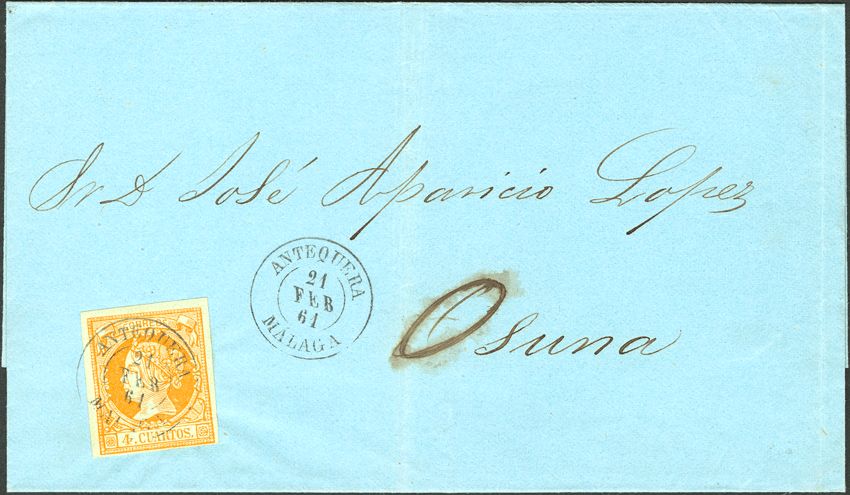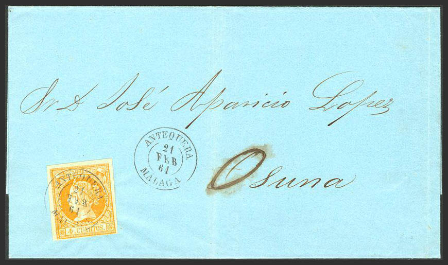 52. 1861. 4 cuartos yellow. ANTEQUERA to OSUNA. Postmark ANTEQUERA / MALAGA. MAGNIFICENT.