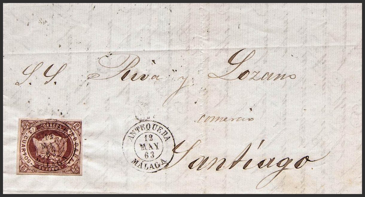 58. 1863. 4 cuartos chestnut. ANTEQUERA to SANTIAGO. Postmark ANTEQUERA / MALAGA. MAGNIFICENT.