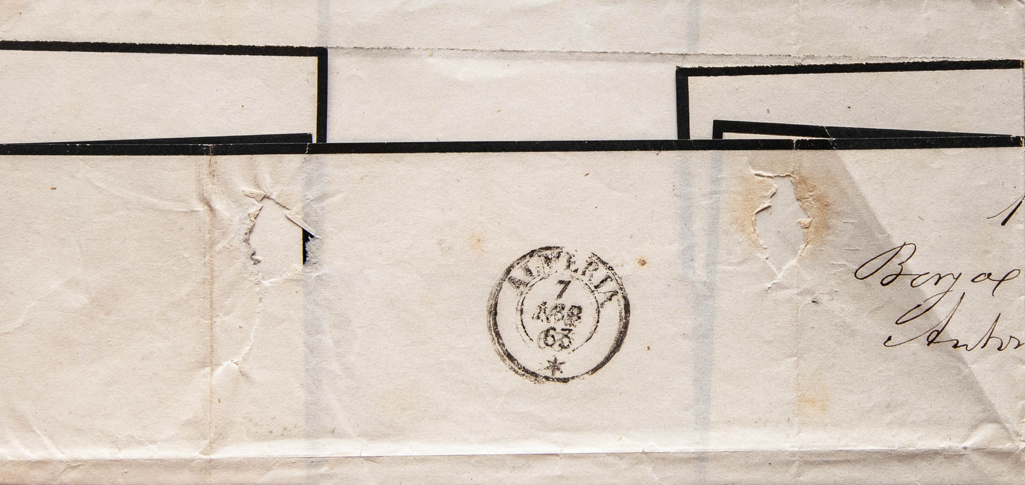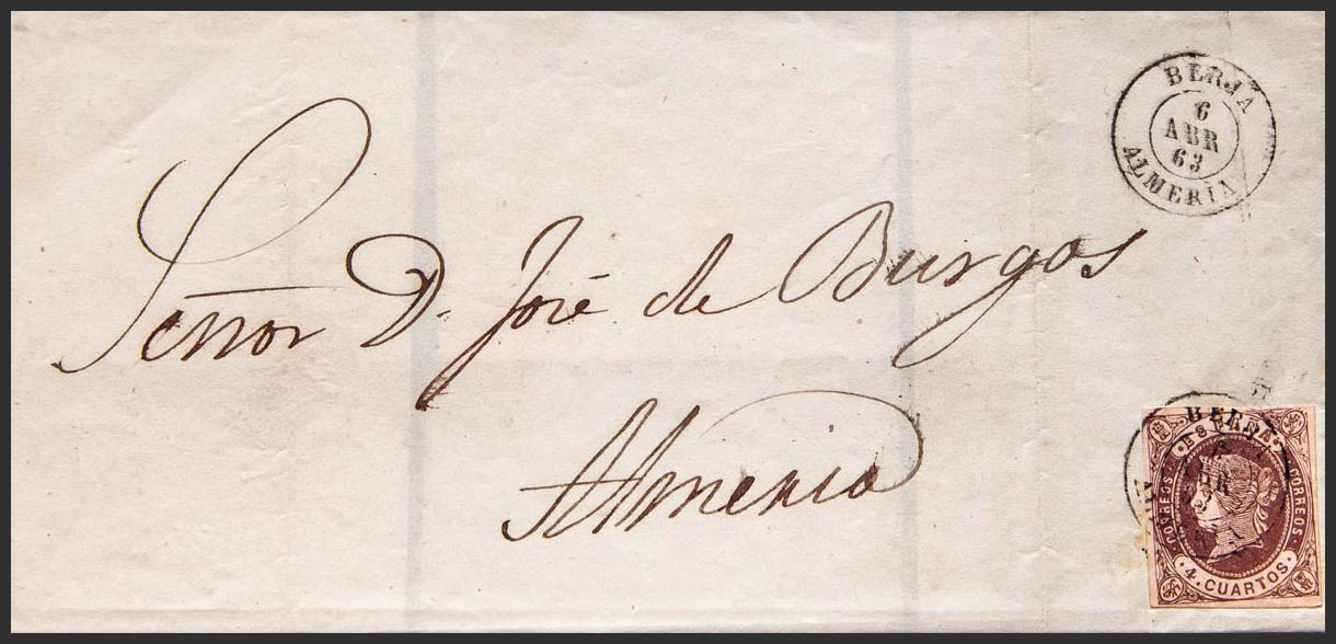 58. 1863. 4 cuartos chestnut. BERJA to ALMERIA. Postmark BERJA / ALMERIA. MAGNIFICENT.