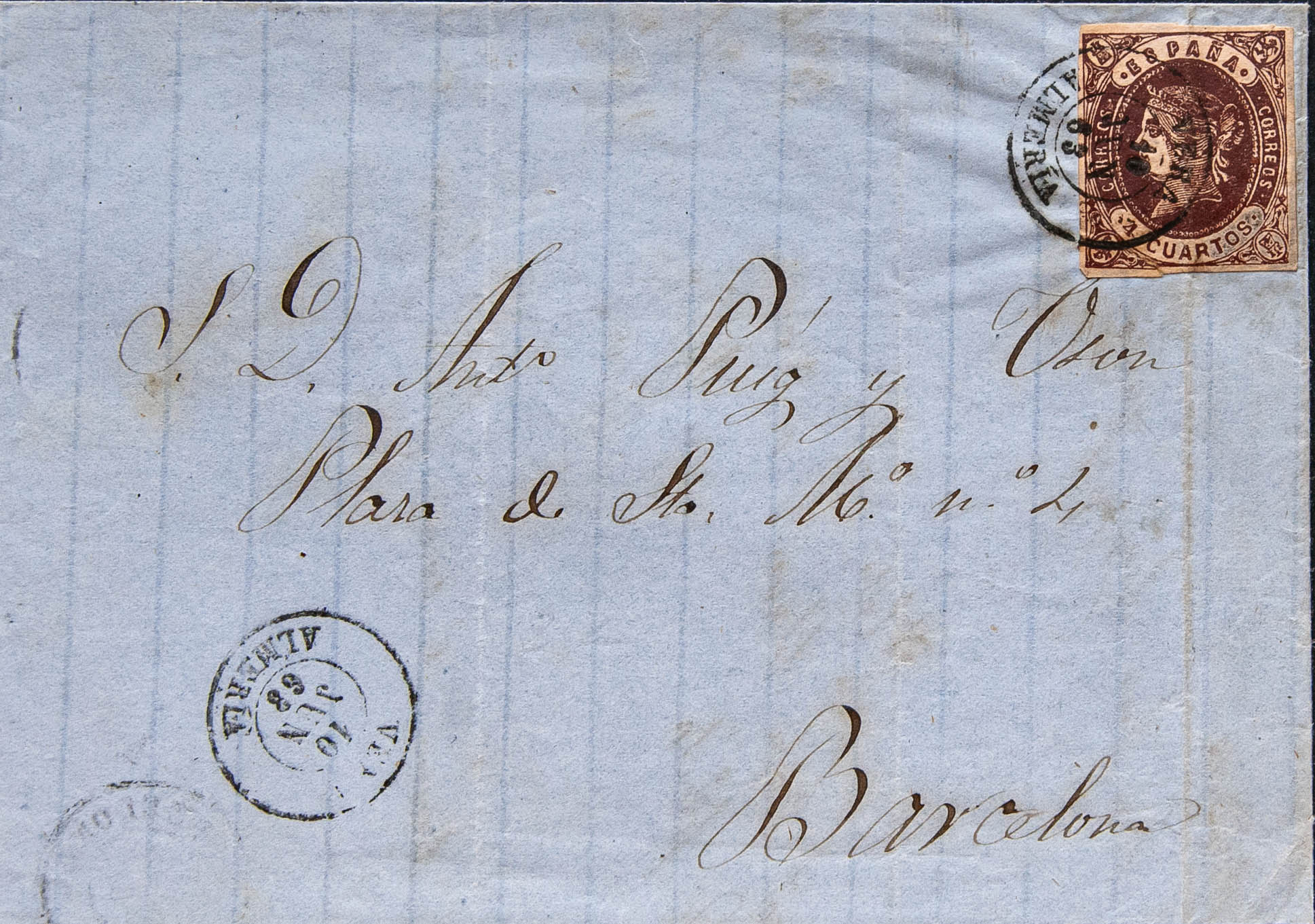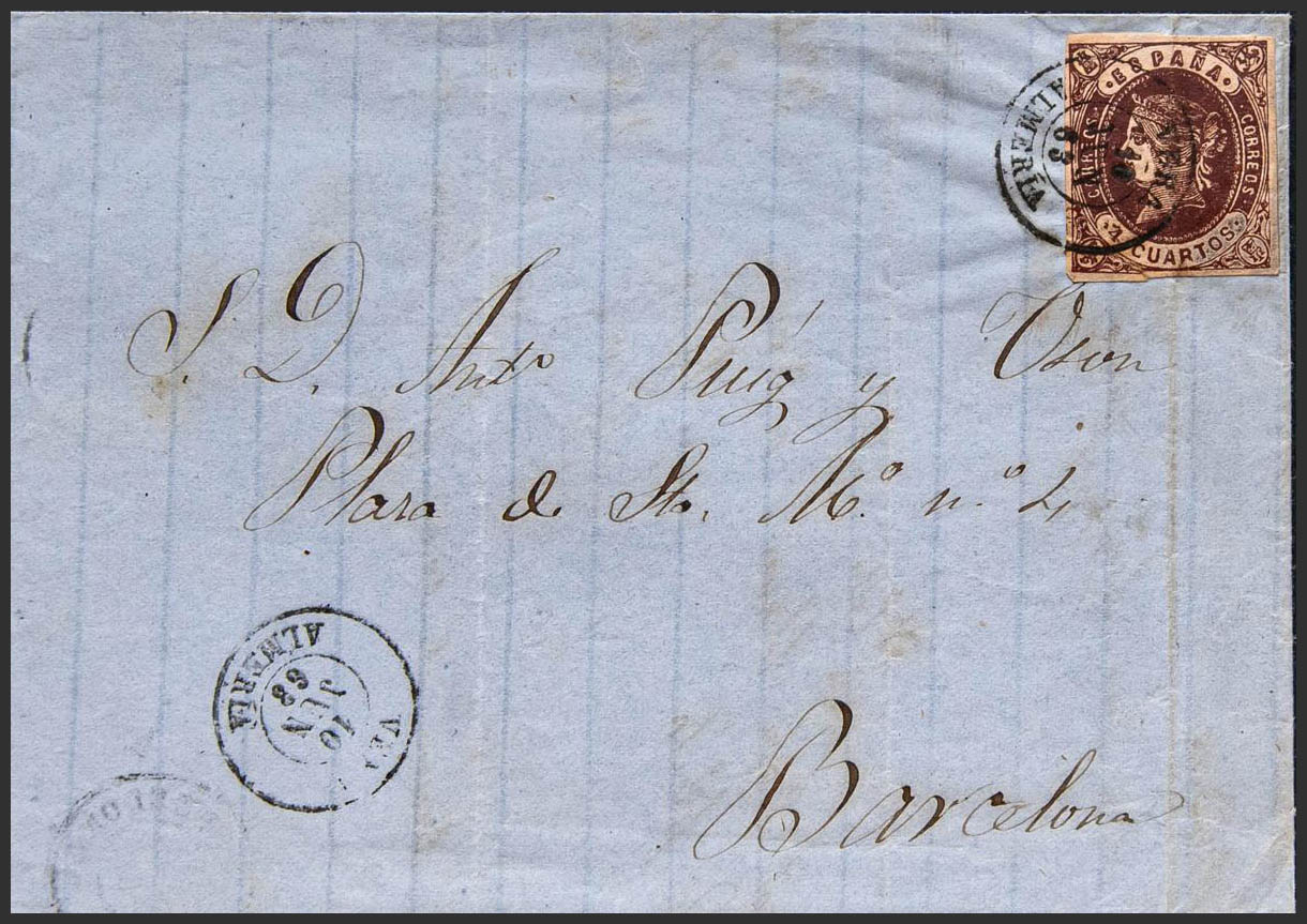 58. 1863. 4 cuartos chestnut. SEE BARCELONA. Postmark VERA / ALMERIA. MAGNIFICENT.
