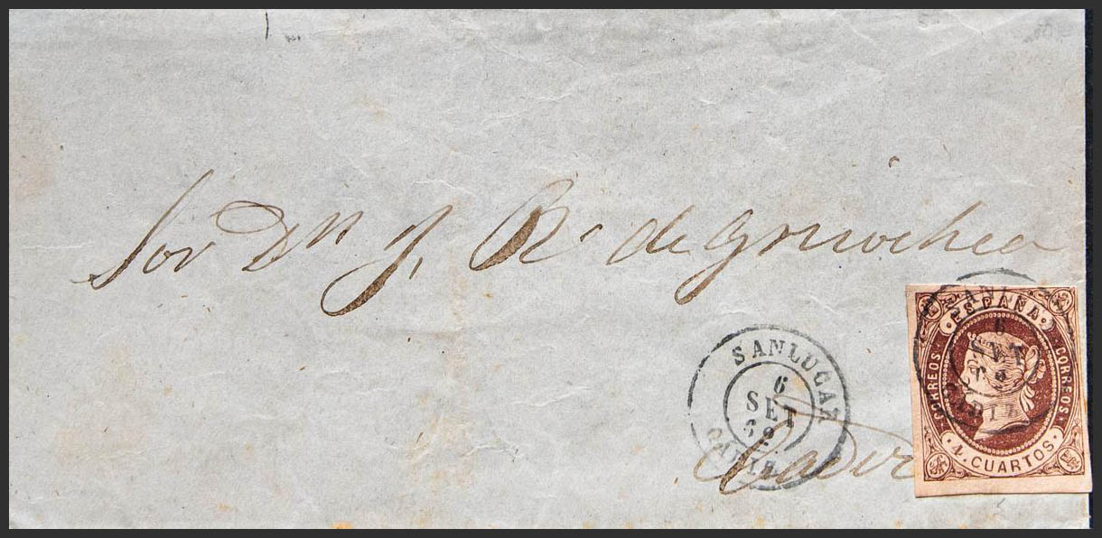 58. 1862. 4 cuartos chestnut. SANLUCAR DE BARRAMEDA to CADIZ. SANLUCAR / CADIZ postmark. MAGNIFICENT.