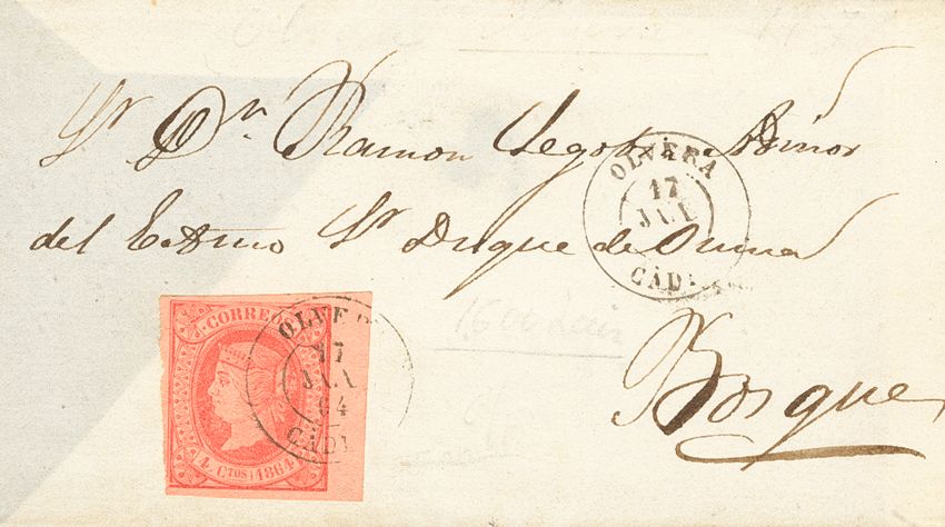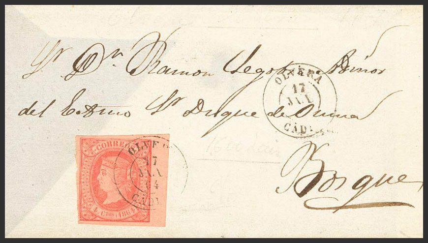 64. 1864. 4- cuartos rose, leaf edge. OLVERA to FORESTS. Postmark OLVERA / CADIZ. MAGNIFICENT.