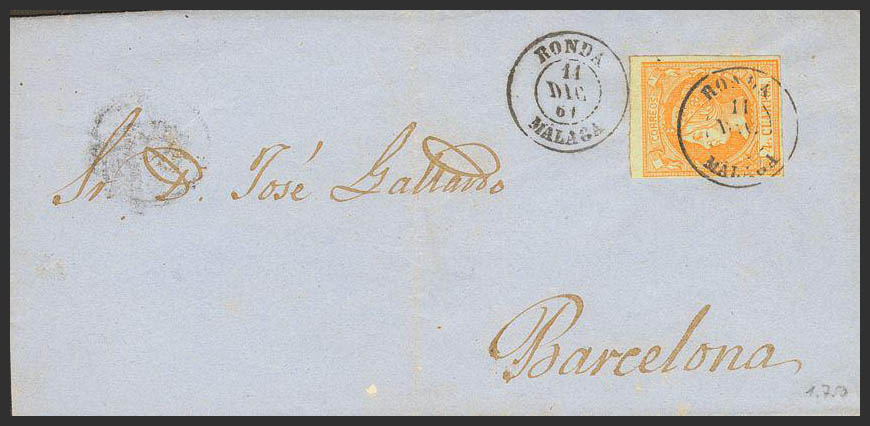 52. 1861. 4 cuartos yellow. RONDA to BARCELONA. Postmark ROUND / MALAGA. MAGNIFICENT.