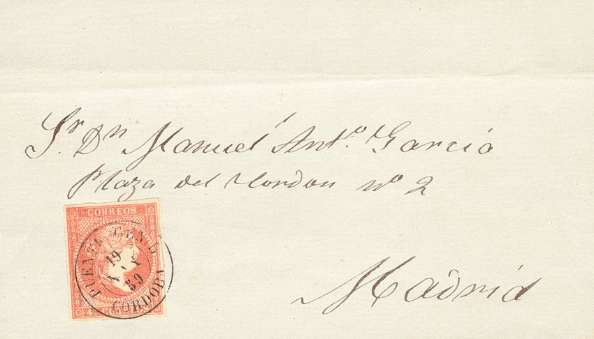 48. 1859. 4 red cuartos . Front of PUENTE GENIL to MADRID. Postmark BRIDGE GENIL / CORDOBA. MAGNIFICENT.