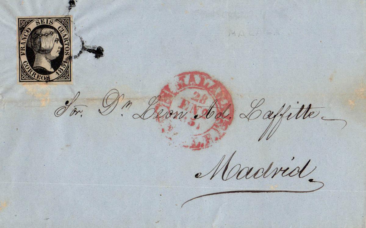 English |ABOUT| 6. 1851. 6 black quarters. MALAGA to MADRID. On the Baeza front MALAGA / ANDAL.B. MAGNIFICENT.