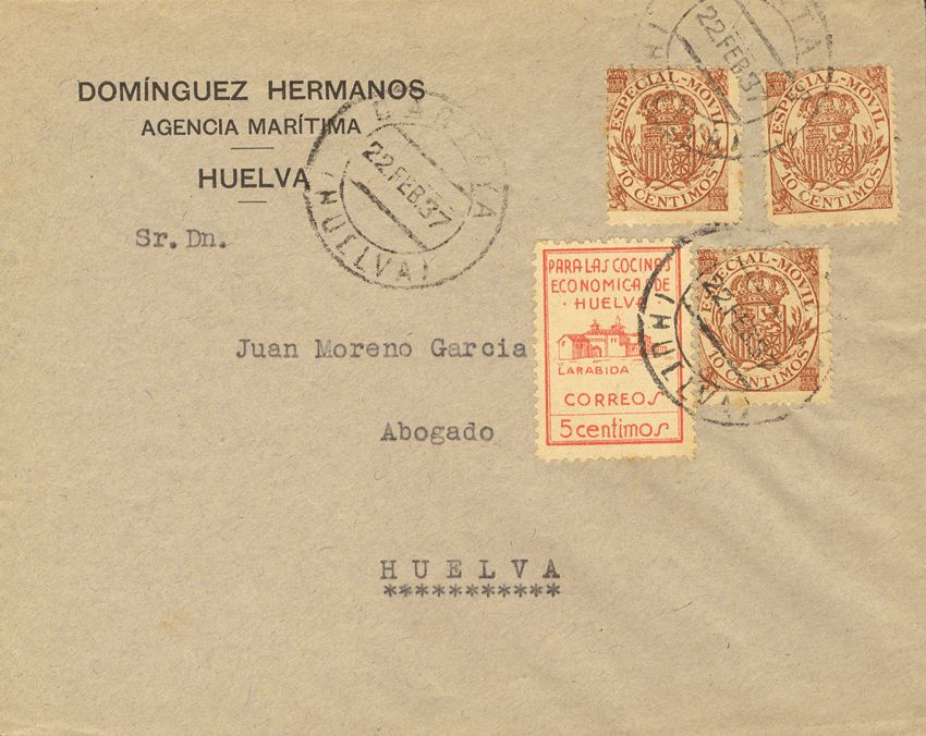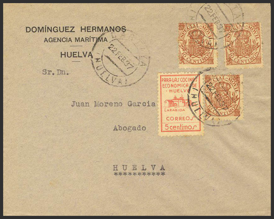 Phys 26(3). 1937. 10 cts MOBILE, three stamps. CARTAYA to HUELVA. MAGNIFICENT AND RARE.