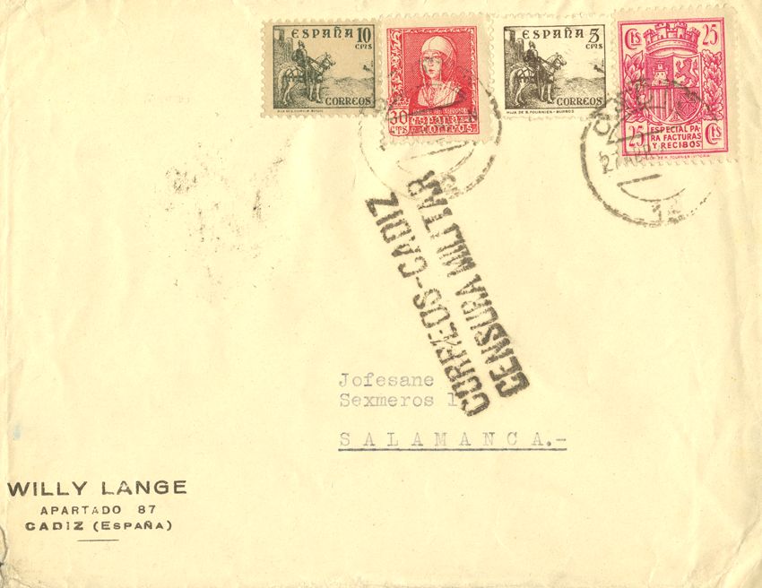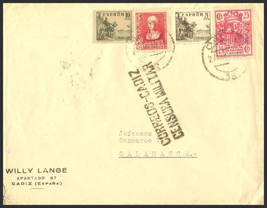 Fis 24. 1939. 25 cts INVOICES. CADIZ to SALAMANCA. On the back arrival. MAGNIFICENT AND RARE POSTAGE.