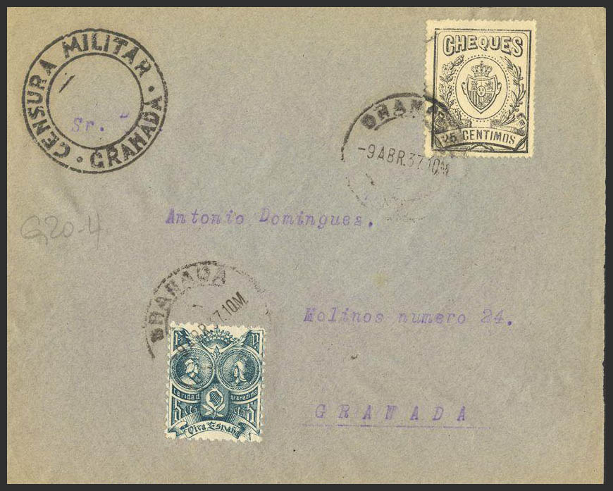 Fis 15. 1937. 25 cts black CHECKS, Internal Mail of GRANADA. On the back arrival. MAGNIFICENT.