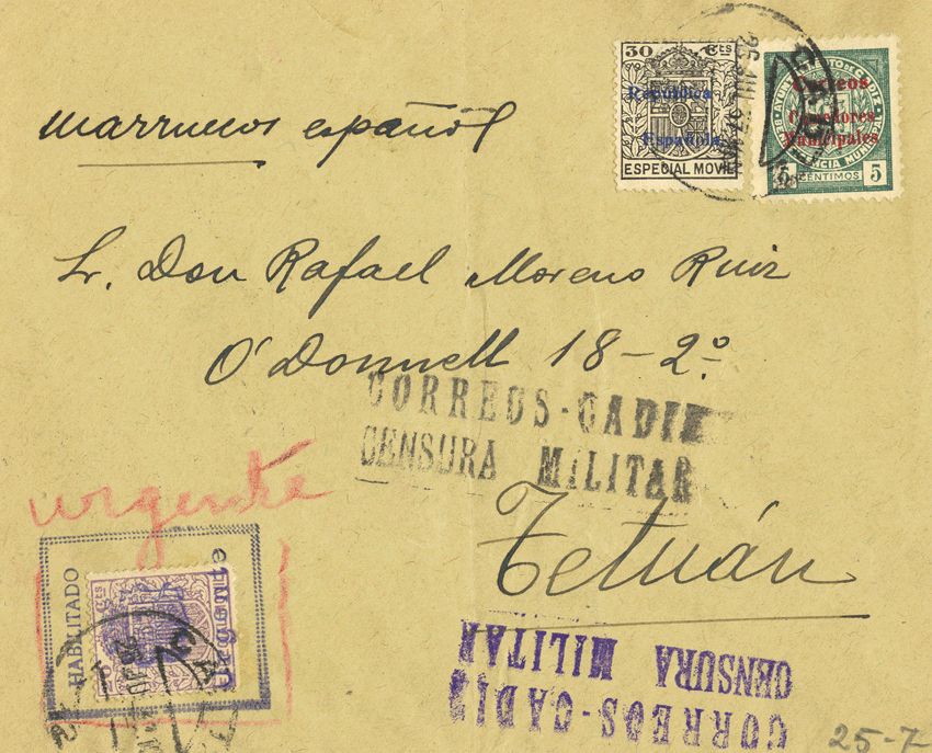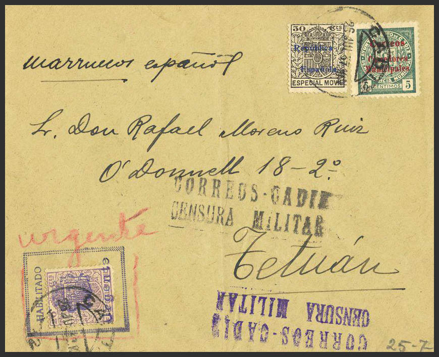 Fis 45. 1937. 30 cts black MOBILE and stamp ENABLED / URGENT. Certificate from CADIZ to TETUAN. On the back transit and arrival. MAGNIFICENT AND RARE.