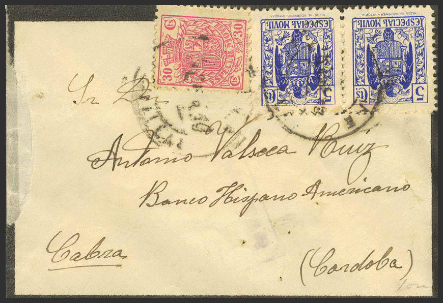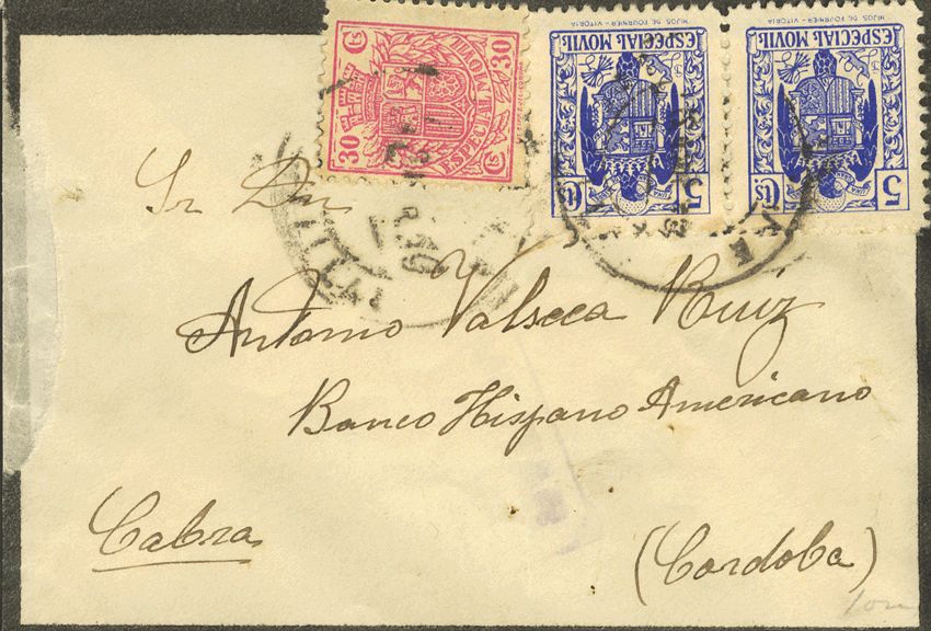 Fis 92, 101(2). 1939. 30 cts pink and 5 cts blue, pair MOBILES. ECIJA to GOAT. MAGNIFICENT.