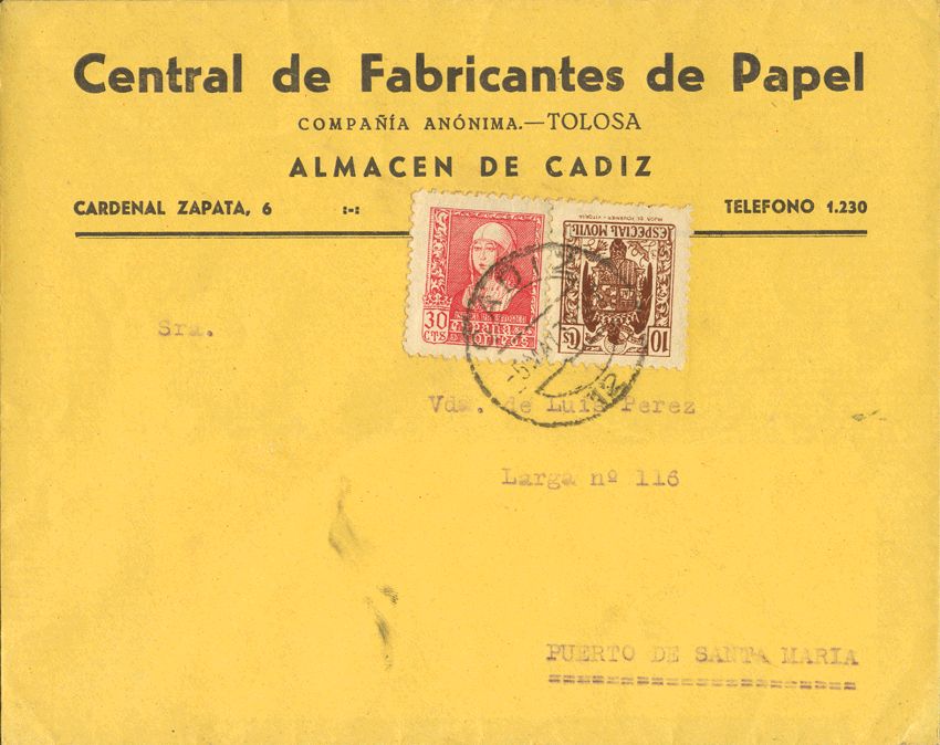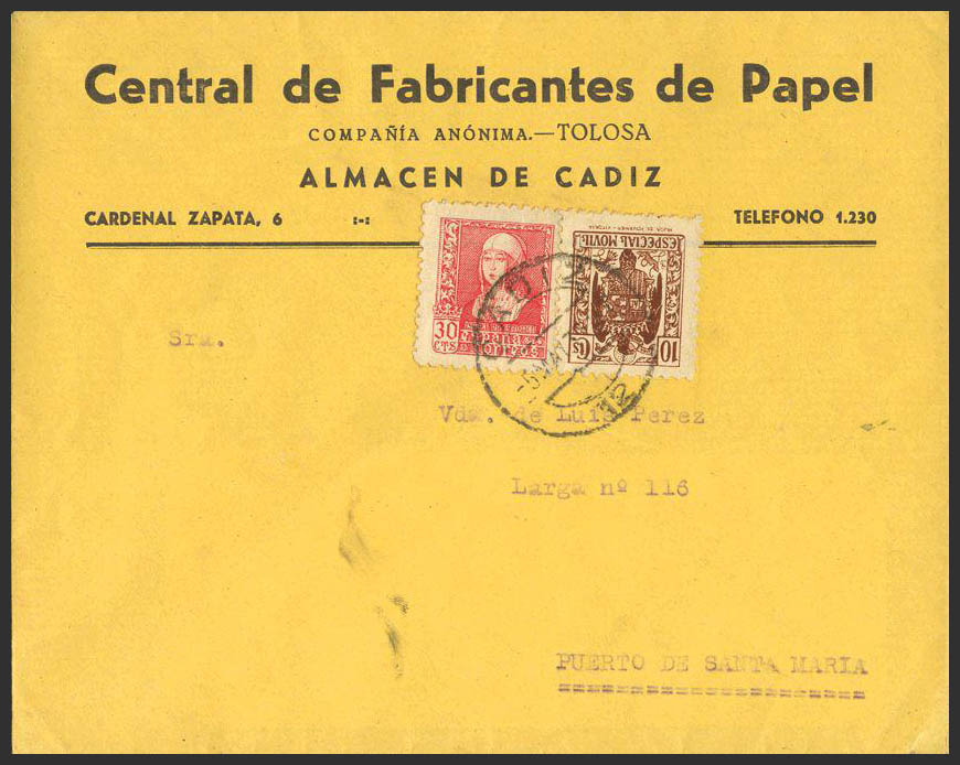 856, Fis 102. 1939. 10 cts brown MOVIL and 30 cts red. CADIZ to PORT OF SANTA MARIA. MAGNIFICENT.