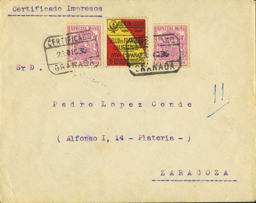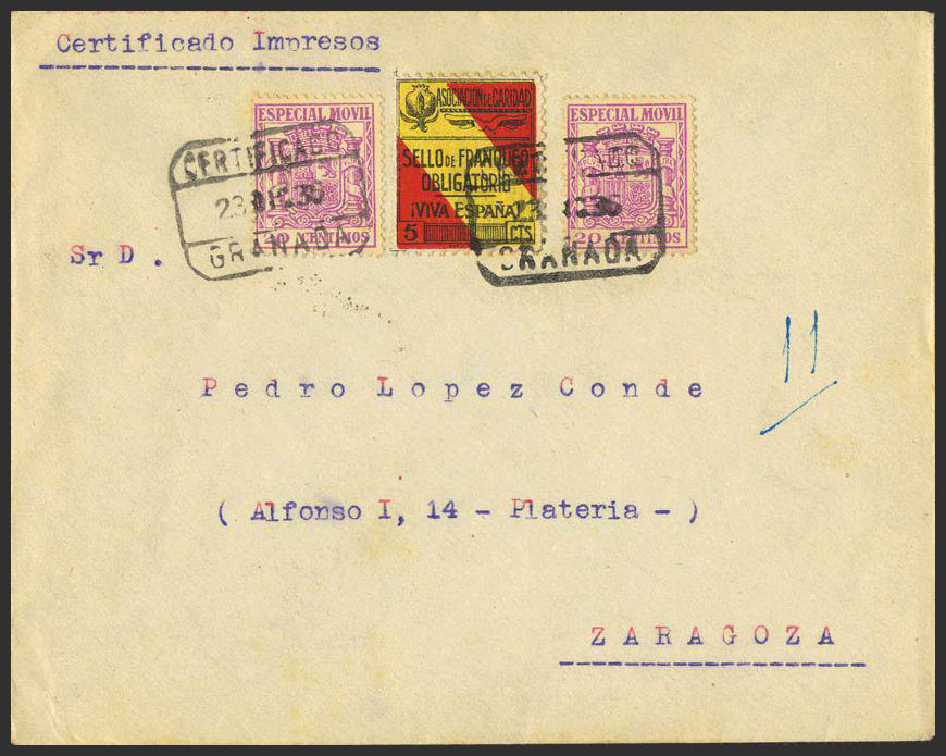 Phys 52(2). 1936. 20 lilac cts, two MOBILE stamps. Certificate from GRANADA to ZARAGOZA. On the back arrival. MAGNIFICENT.