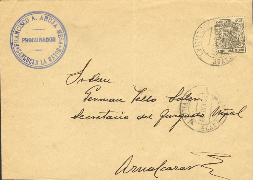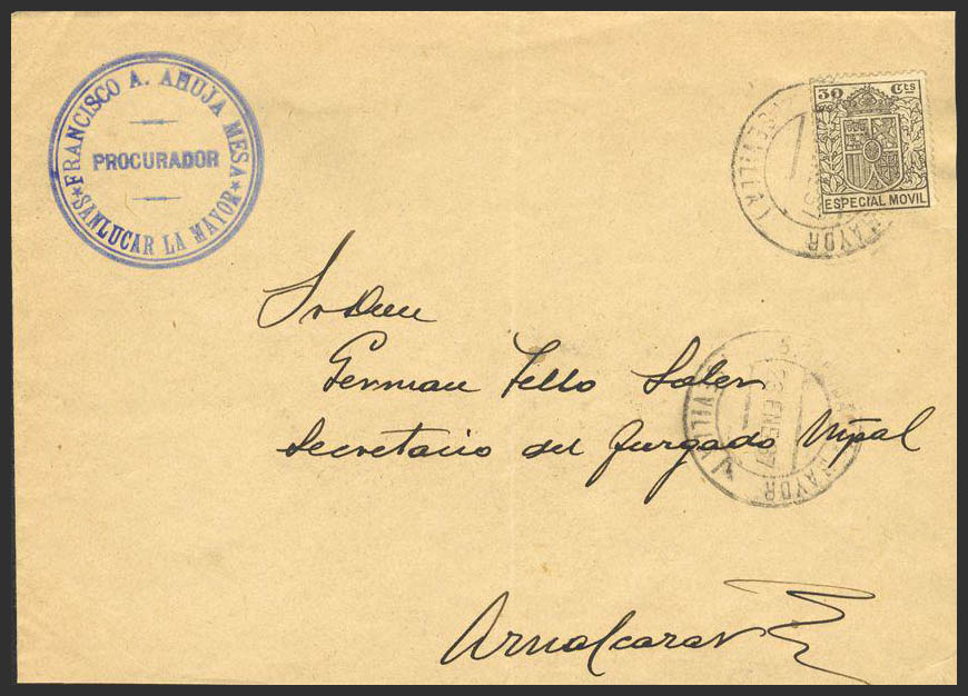 Fis 35. 1937. 30 cts gray MOBILE. SAN LUCAR LA MAYOR to AZNALCAZAR. On the back arrival. MAGNIFICENT.