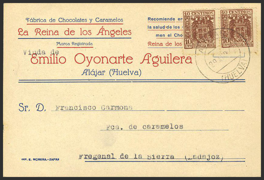 1943. 10 chestnut cts, MOBILE pair. Postcard from ALAJAR to FRGENAL DE LA SIERRA. MAGNIFICENT AND NOT LISTED.