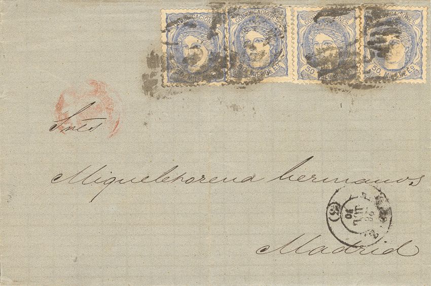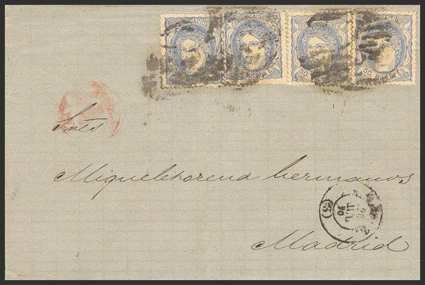 107(4). 1870. 50 blue mils, four stamps. CADIZ to MADRID. Quadruple size. MAGNIFICENT AND RARE.