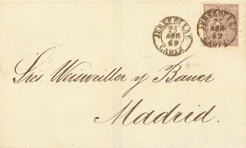 98. 1869. 50 mils violet. SHERRY to MADRID. Postmark JEREZ DE LA F. / CADIZ (Type I). MAGNIFICENT.